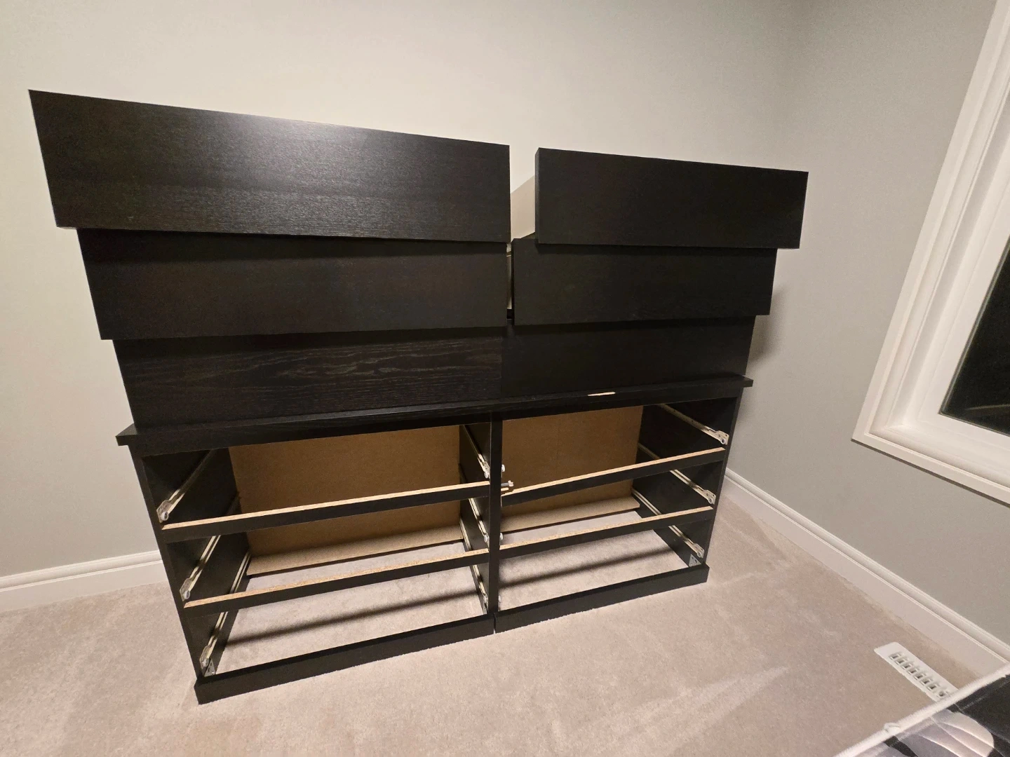 Selling an IKEA Hemnes dresser in black-brown. It's partially disassembled, but all the pieces and hardware are included. Ready for easy transport and assembly!