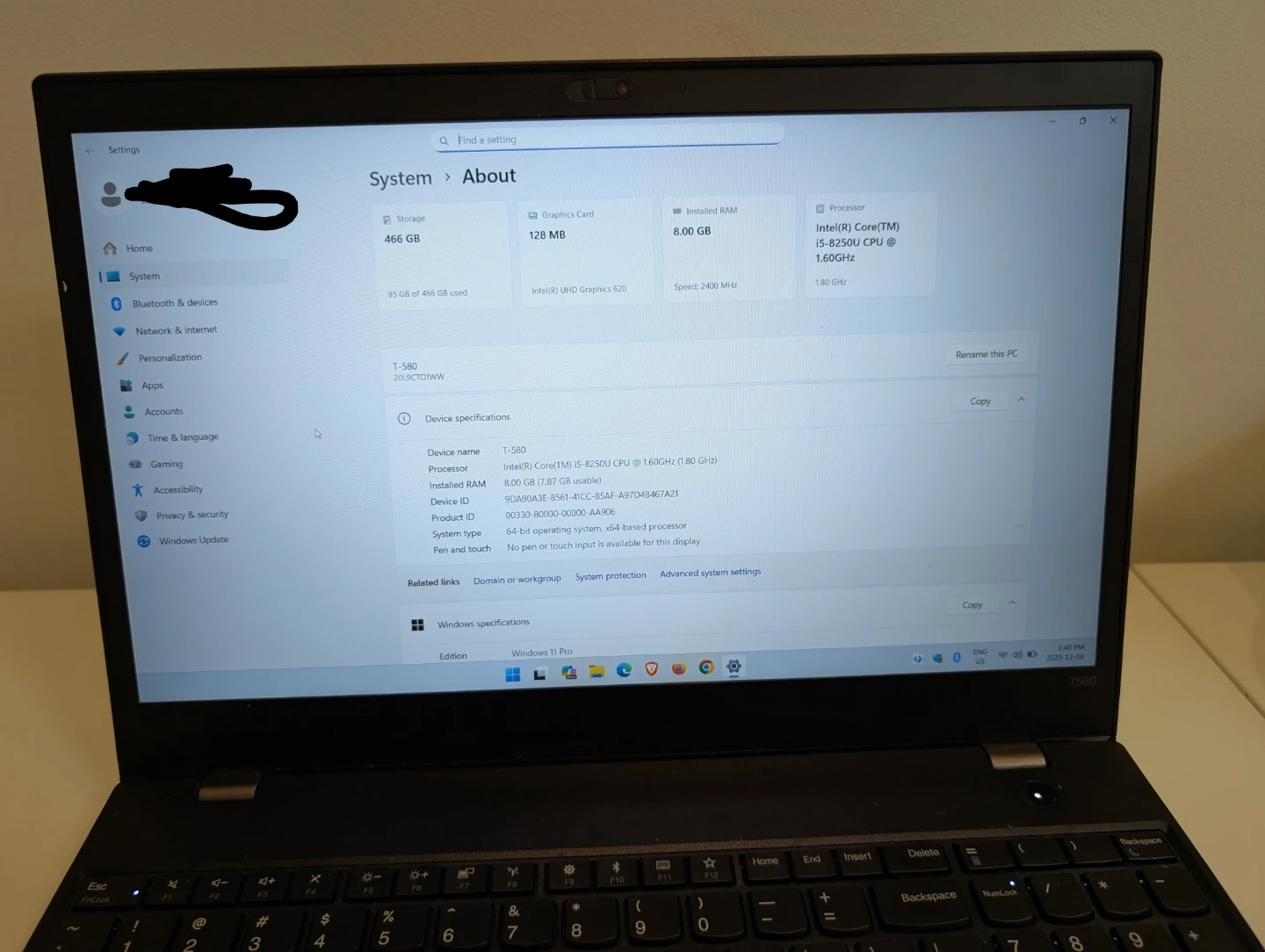 - Processor: Intel(R) Core(TM) i5-8250U CPU @ 1.60GHz