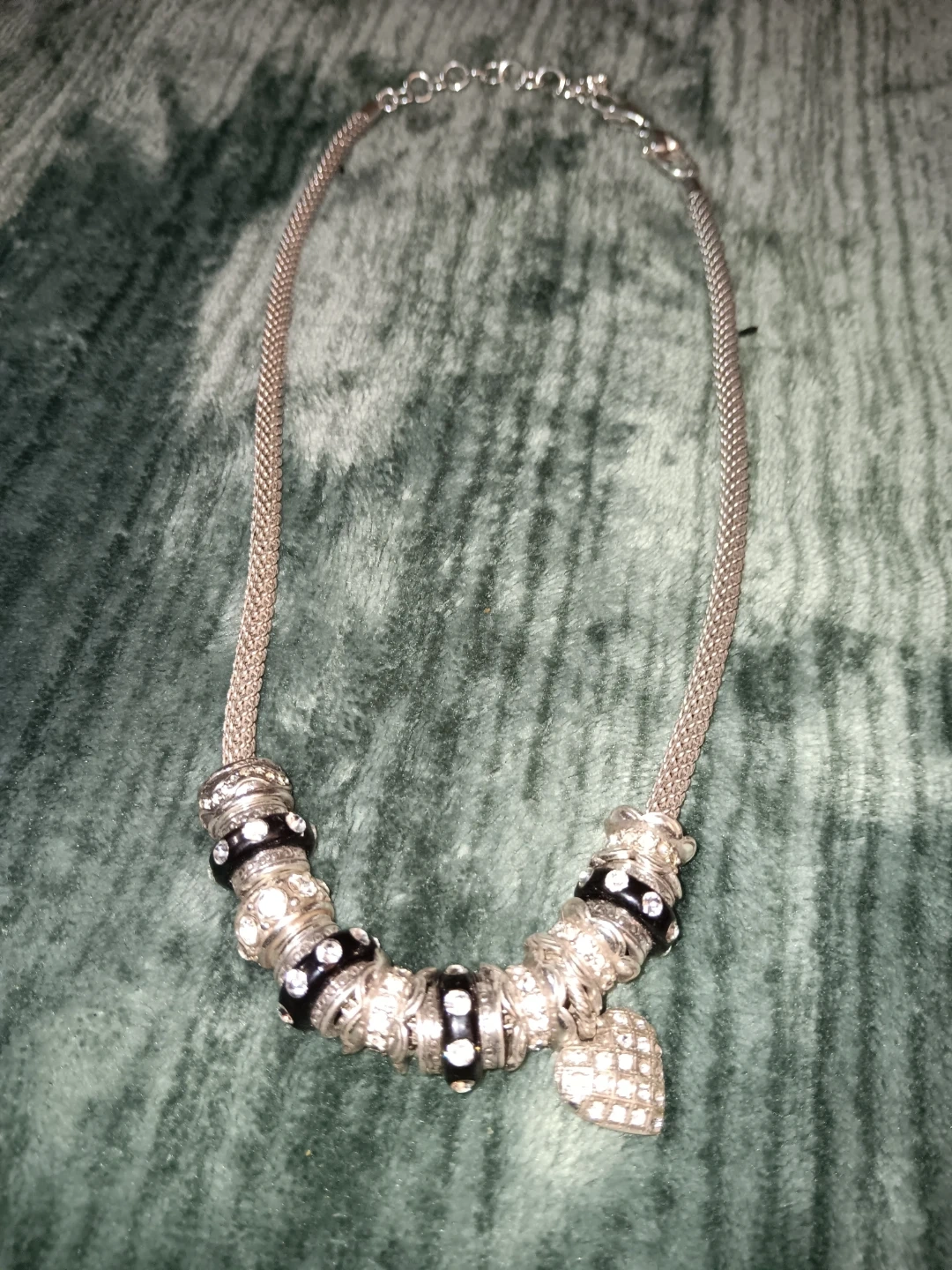 This is a lovely charm necklace featuring a heart pendant. It has a unique design with black and silver coloured beads adorned with rhinestones. It's in great condition and would make a wonderful addition to any jewelry collection!