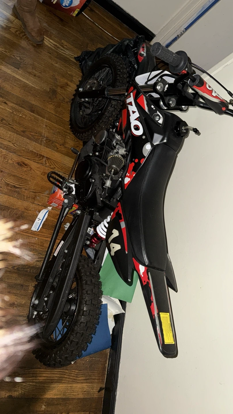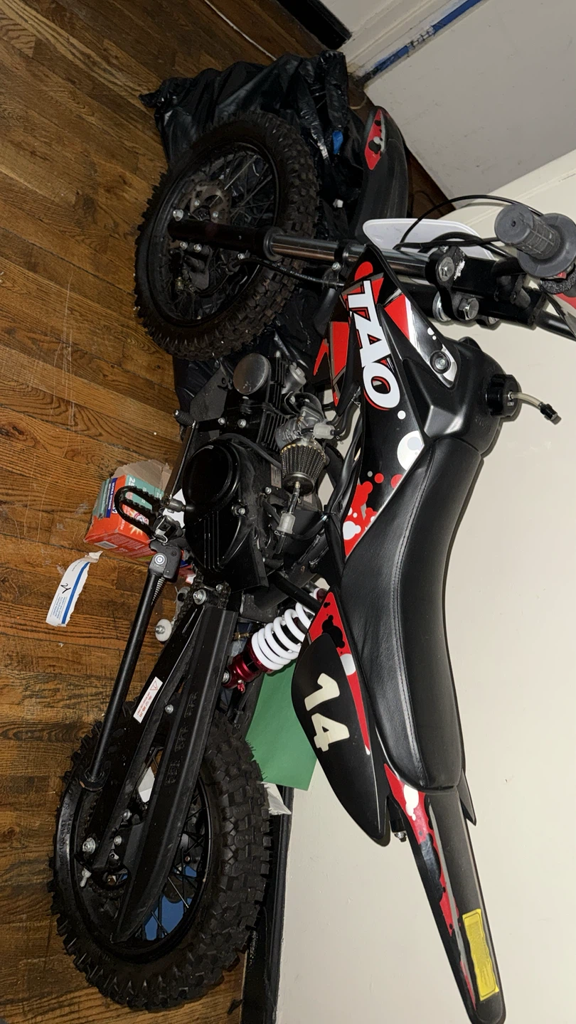 Selling a Tao Motor dirt bike in black and red. It's perfect for off-road adventures and some fun! The bike is in used condition and ready for its next rider. Feel free to reach out if you have any questions!