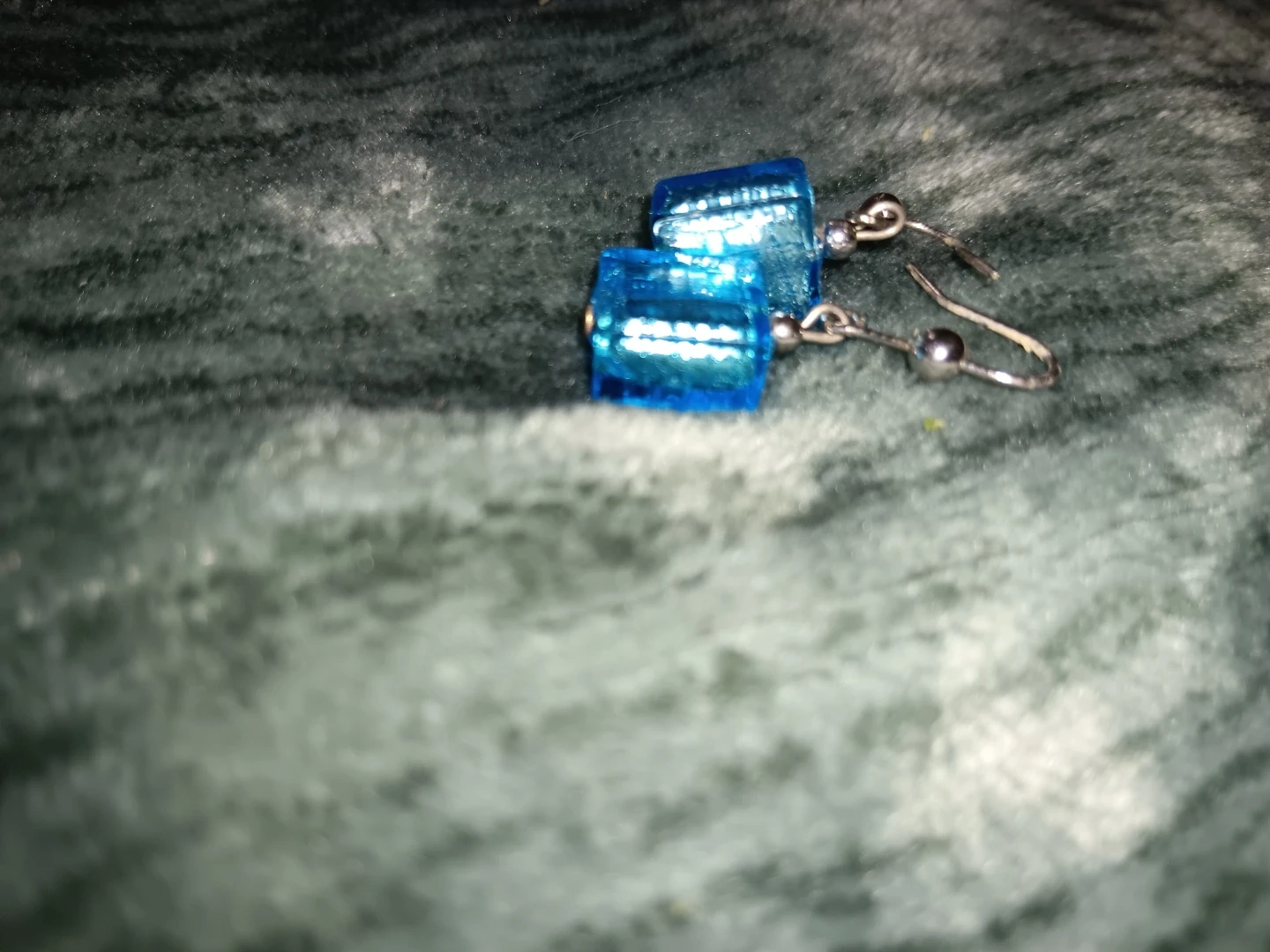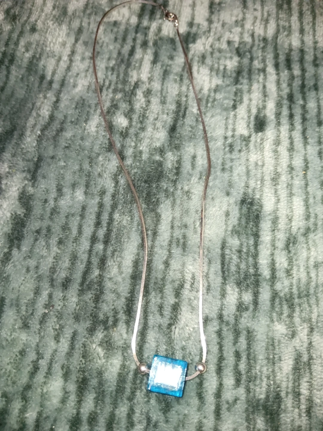 Here's a cute matching necklace and earring set! The set features a silver chain and earring hooks with a bright blue cube pendant and earring charms. This set would be perfect for adding a pop of colour to any outfit