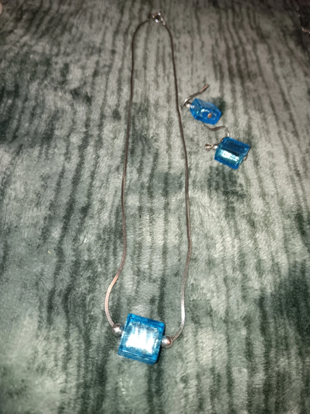 Here's a cute matching necklace and earring set! The set features a silver chain and earring hooks with a bright blue cube pendant and earring charms. This set would be perfect for adding a pop of colour to any outfit