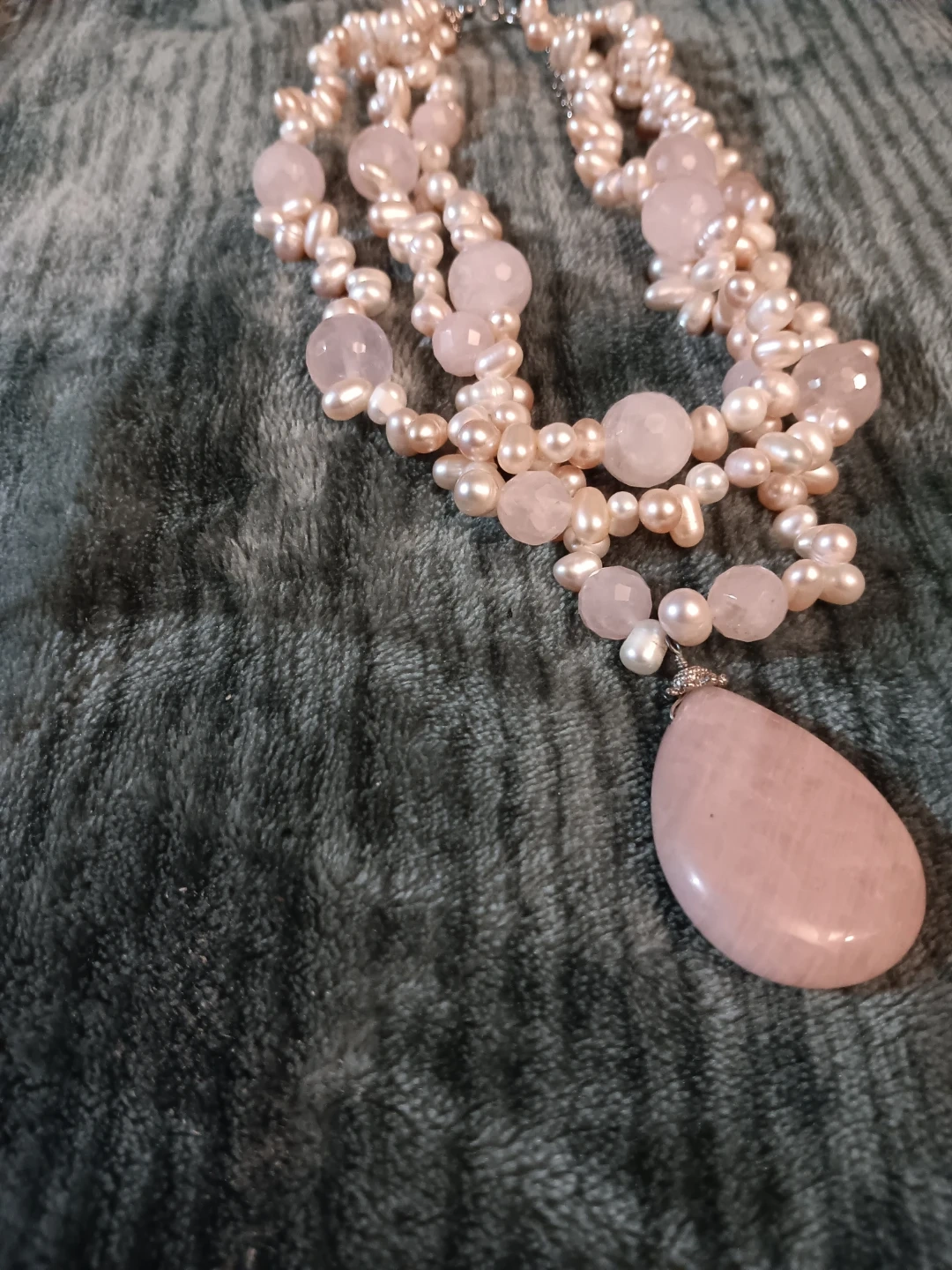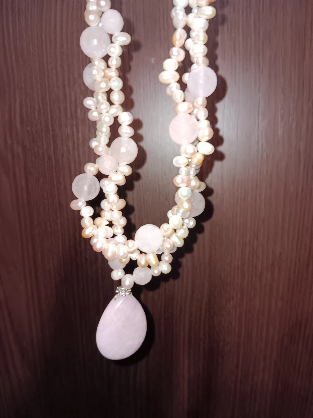 Beautiful necklace featuring freshwater pearls and rose quartz beads. The necklace has a teardrop-shaped rose quartz pendant. It's a unique piece that would add a touch of elegance to any outfit!