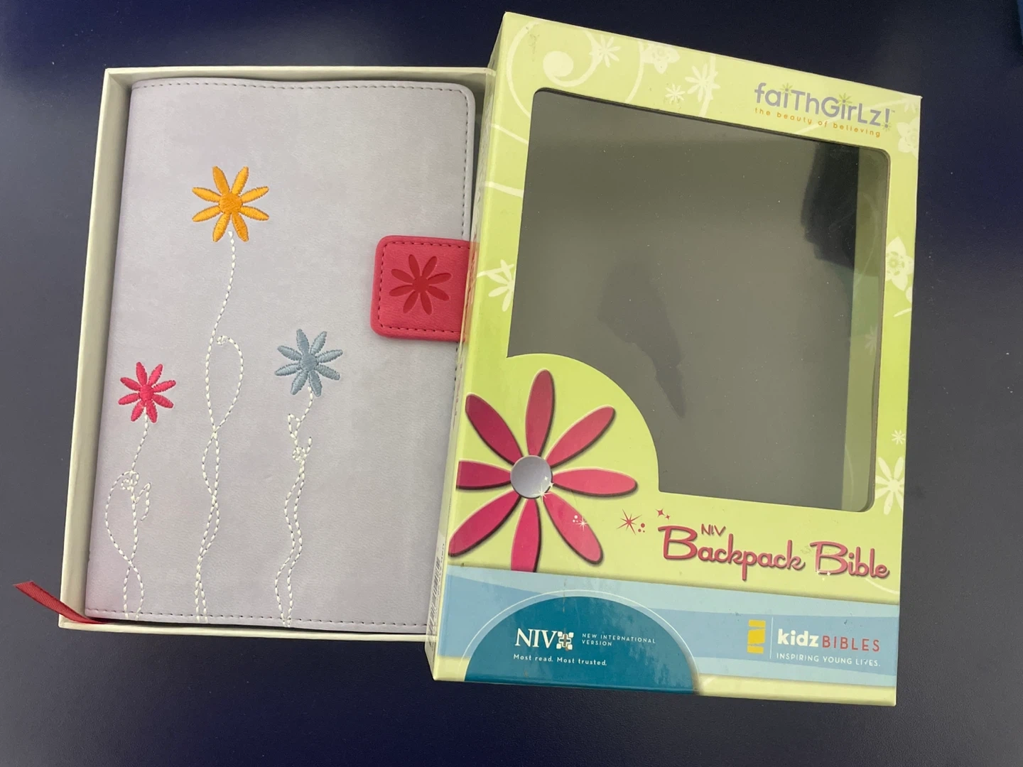 Free like-new faithGirlz! Backpack Bible, NIV (New International Version). It comes in the original box. The bible is light purple with flower embroidery and a pink clasp. It's an inspiring young life's bible! Would be new but a section of the pink clasp fell off