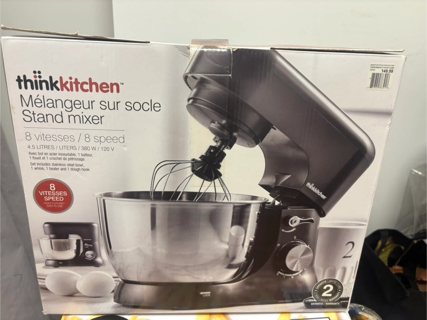 It has 8 speeds and a 4.5 litre capacity. The set includes a stainless steel bowl, whisk, beater, and dough hook. Originally bought for $149.99