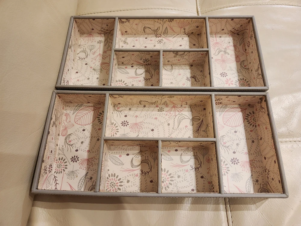 Selling a set of two jewelry drawer organizers! They're perfect for keeping your accessories neat and tidy. The organizers have a lovely floral pattern on the inside and are in great condition