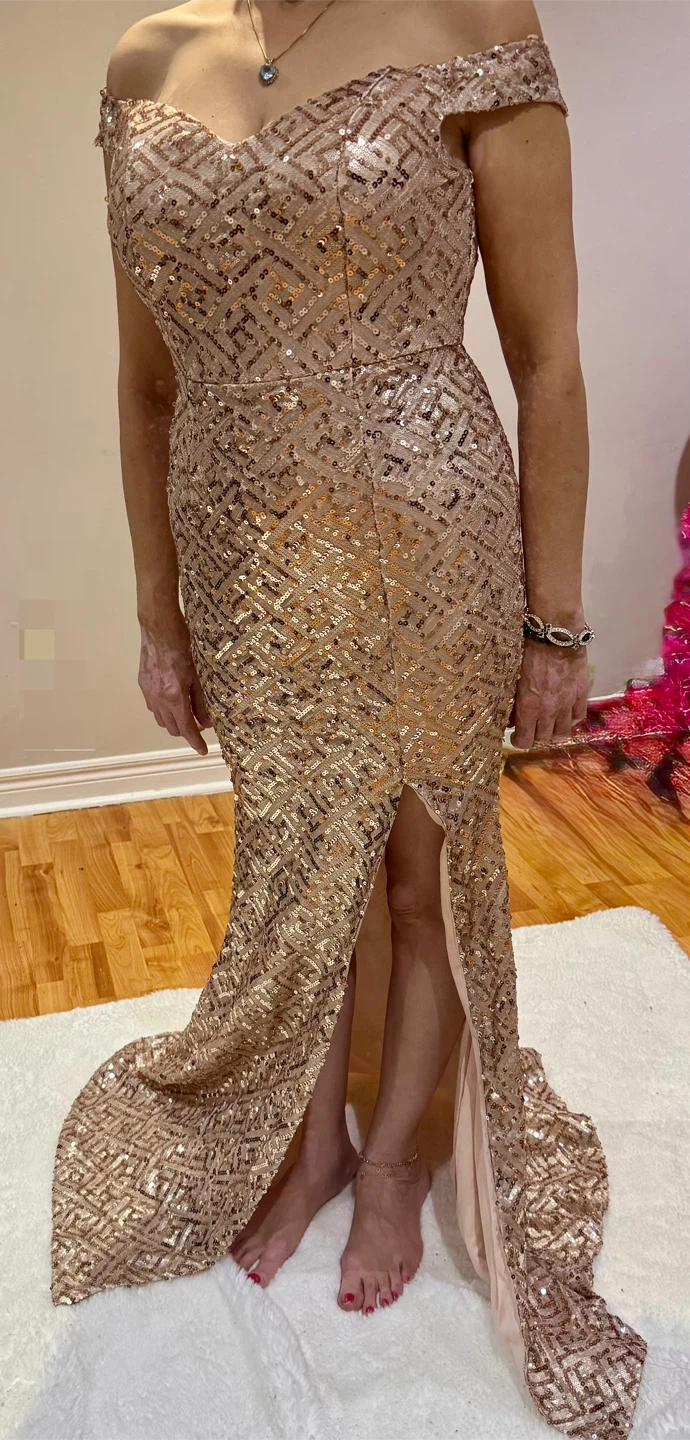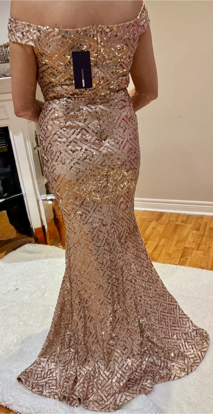Selling a gorgeous Fashion Nova sequin maxi dress in a rose gold colour. It's a size large and has a stylish slit. Perfect for a special occasion!