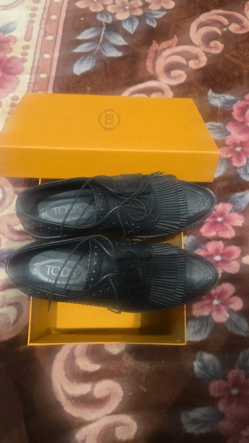 Selling a pair of Tod's dress shoes in black leather! They come with the original box. These shoes are made in Italy and have a stylish, unique design. Perfect for dressing up or adding a touch of class to your everyday look