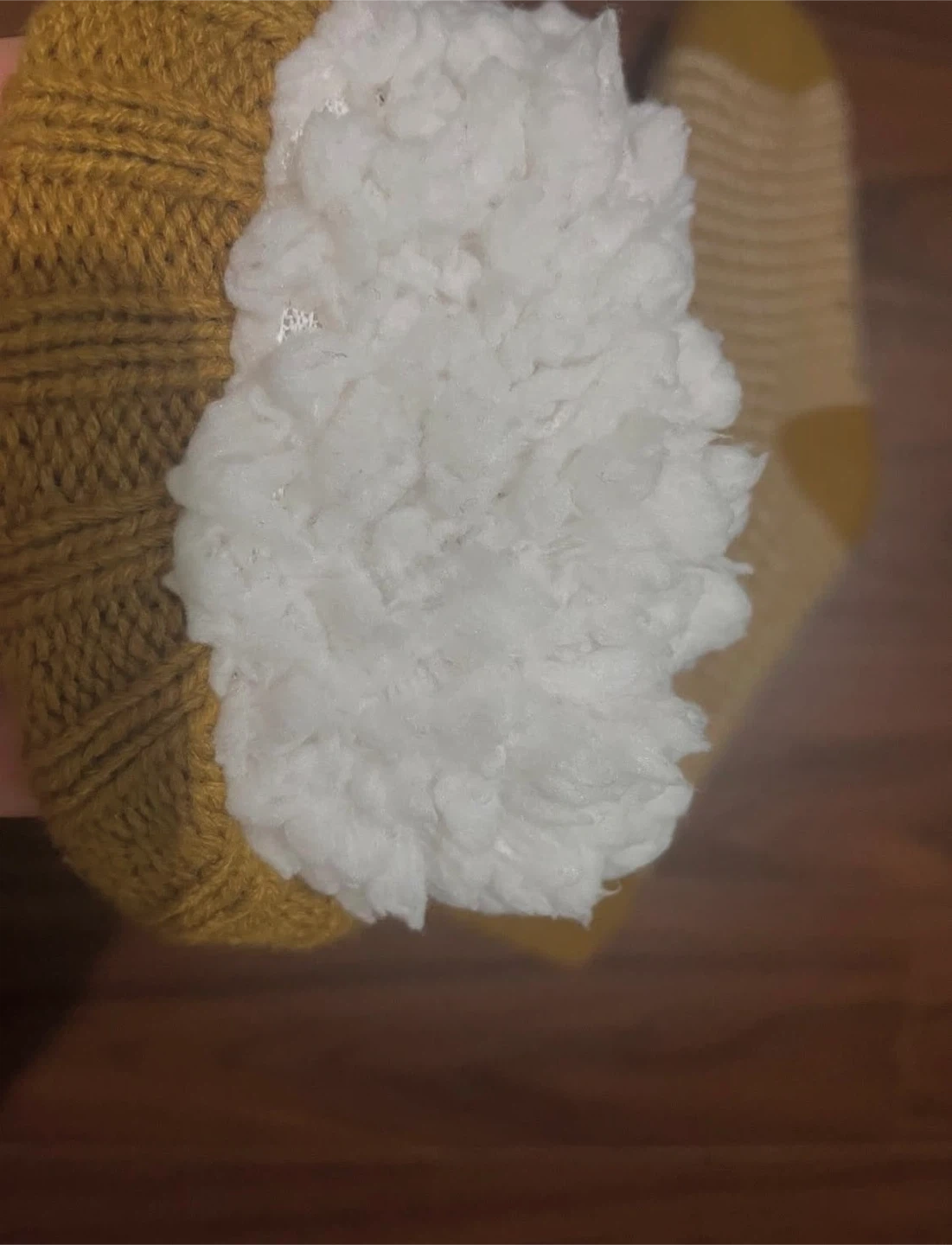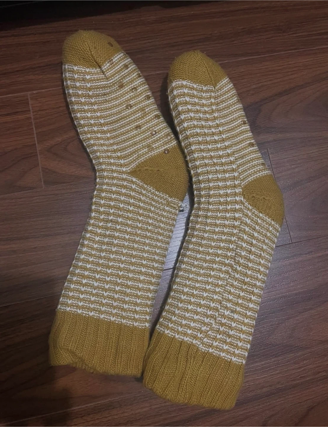 Selling a pair of cozy mustard-coloured socks! They're in great condition and ready to keep your feet warm and stylish. The socks feature a lovely knit pattern with white accents.