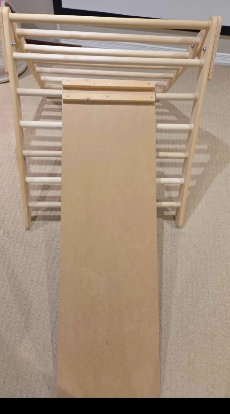 Custom built Pikler Triangle. Frame is made from Pine and Aspen dowels, slide is made from MDF and Pine for climbing rungs. Folds up for storage. Very sturdy and can hold up to 50-60lbs and is about 36" to the top of the triangle.