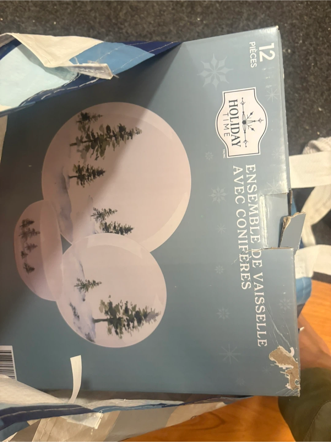 Selling a Holiday Time 12-piece dinnerware set! The set features a wintery design with pine trees, perfect for the holidays or any winter occasion. Never used