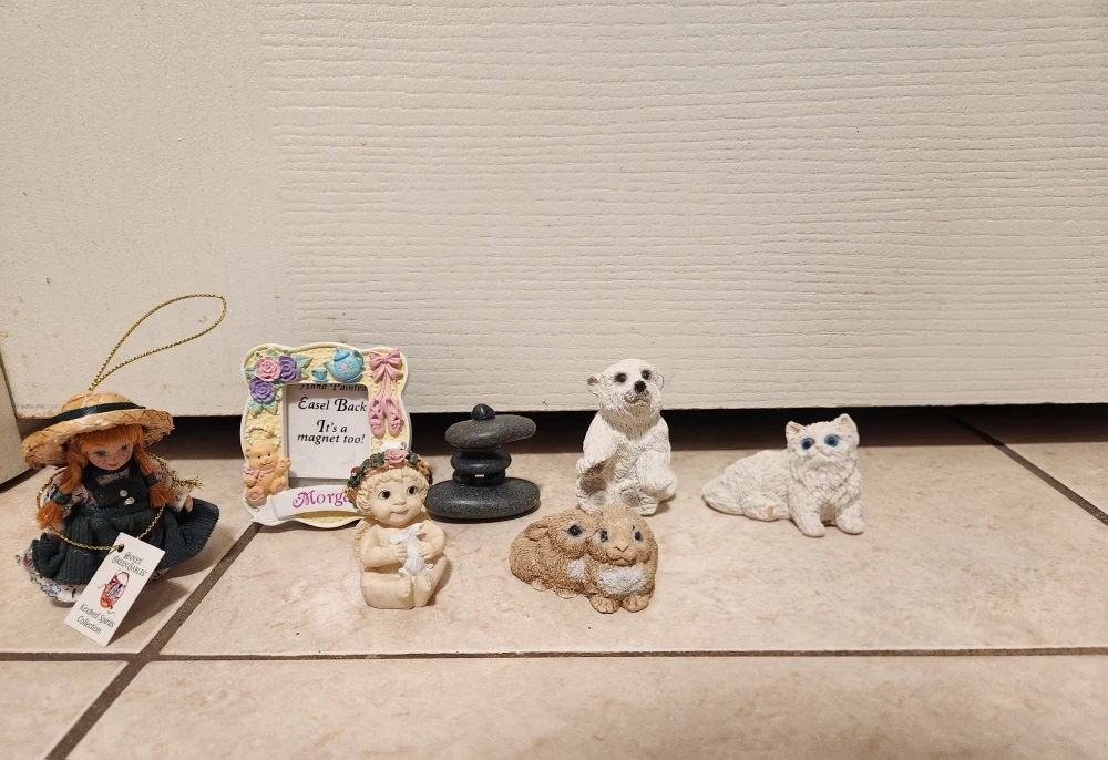 Selling a collection of assorted figurines. Includes a doll, a picture frame, a stone sculpture, a polar bear, a pair of rabbits, and a cat figurine