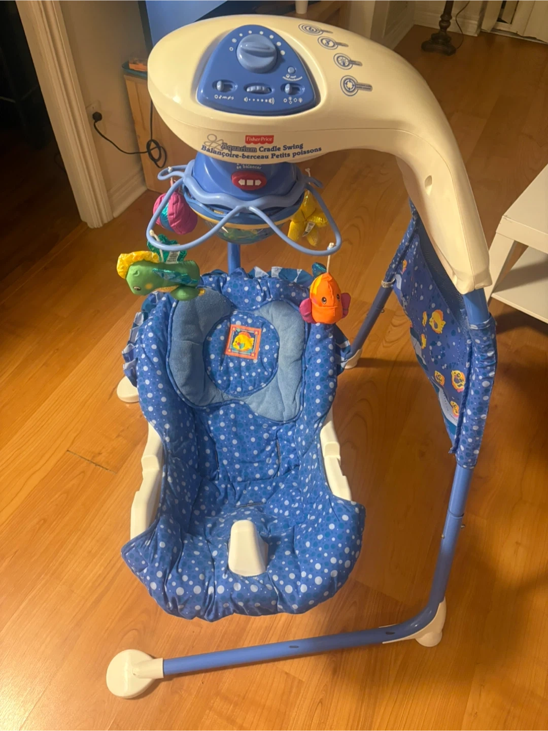 Selling a Fisher-Price Aquarium Cradle Swing! This swing is perfect for soothing your little one with gentle motions and calming sounds. It's in great shape and ready for a new family to enjoy