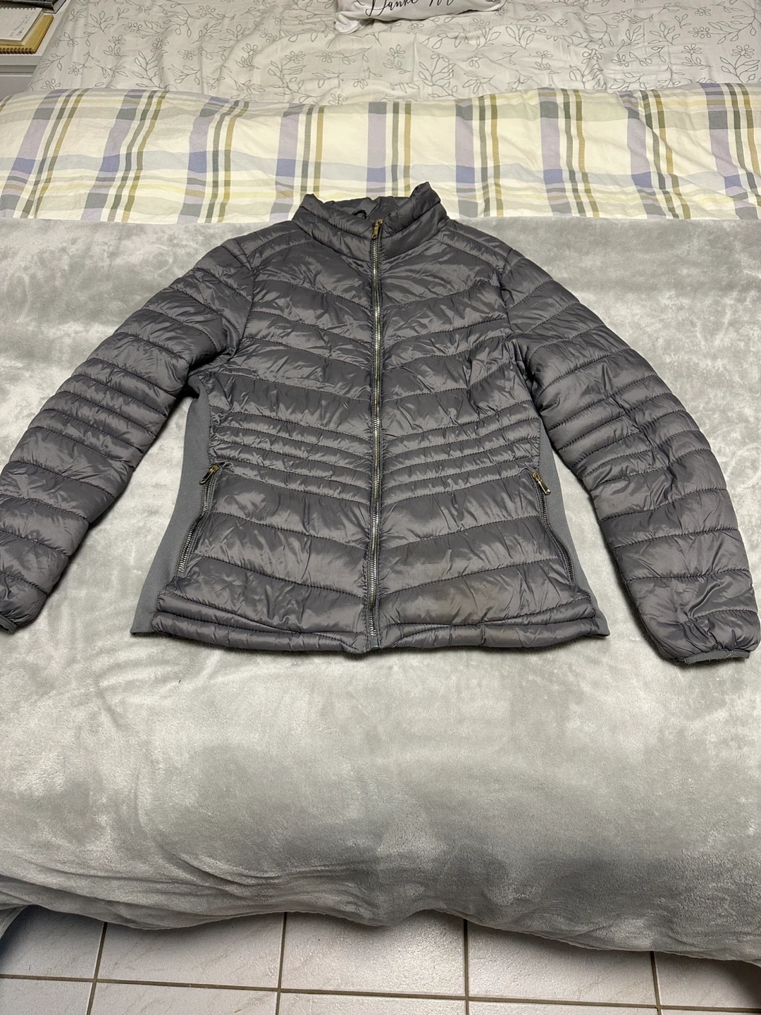 Women's puffer jacket in a neutral grey tone. It's lightweight and perfect for layering during the cooler months. The jacket features a quilted design and a soft lining for extra comfort.