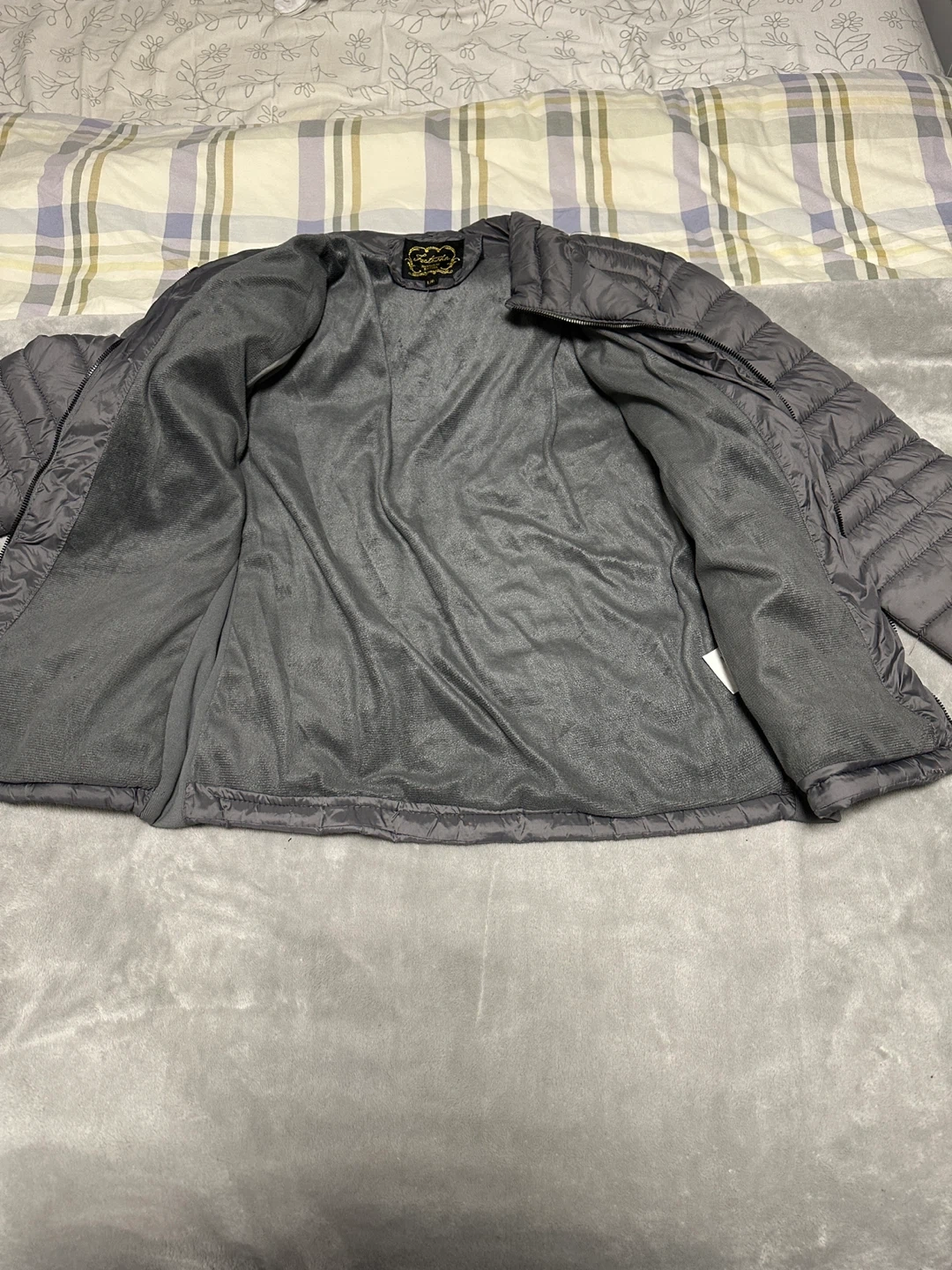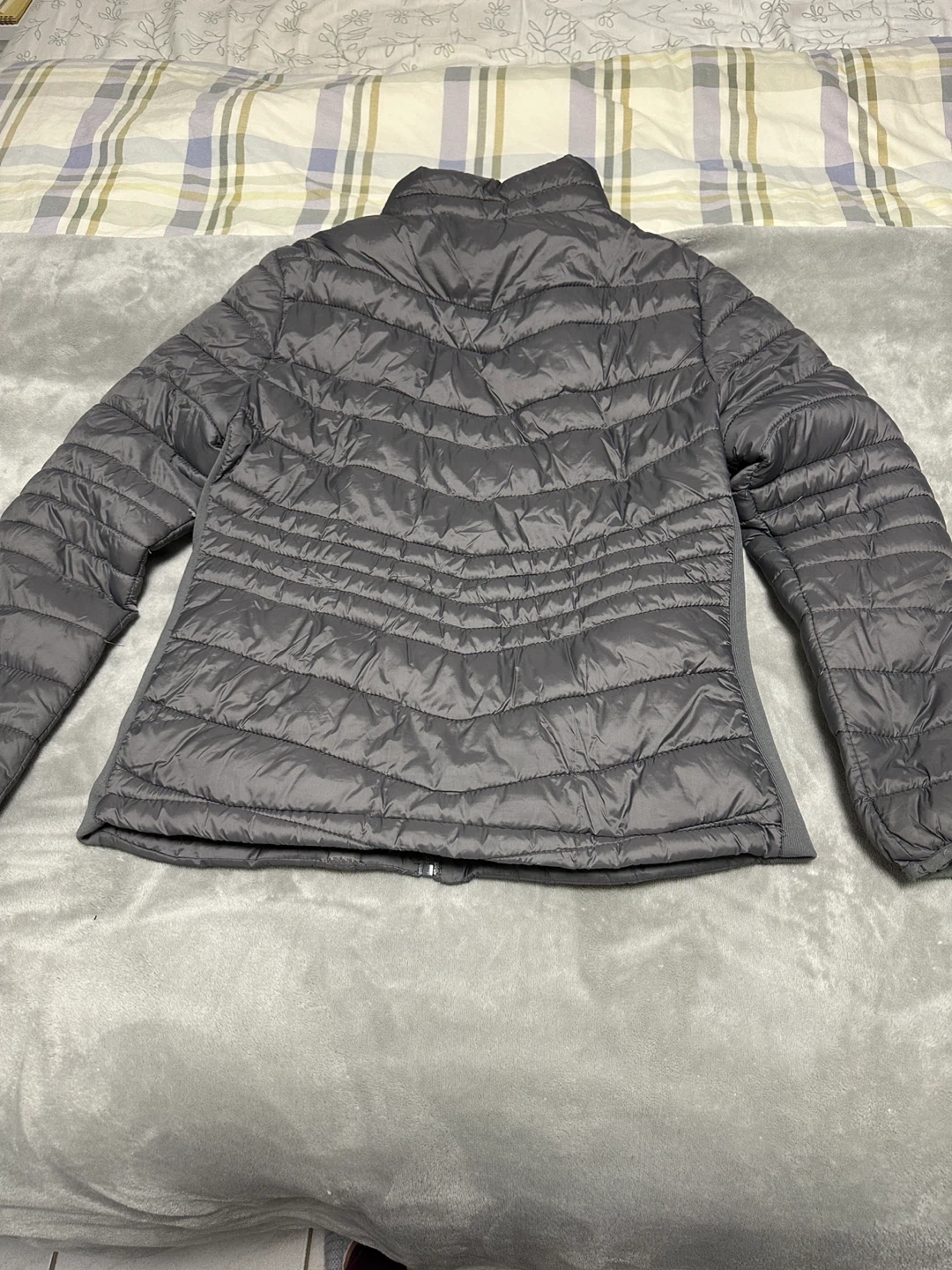 Women's puffer jacket in a neutral grey tone. It's lightweight and perfect for layering during the cooler months. The jacket features a quilted design and a soft lining for extra comfort.