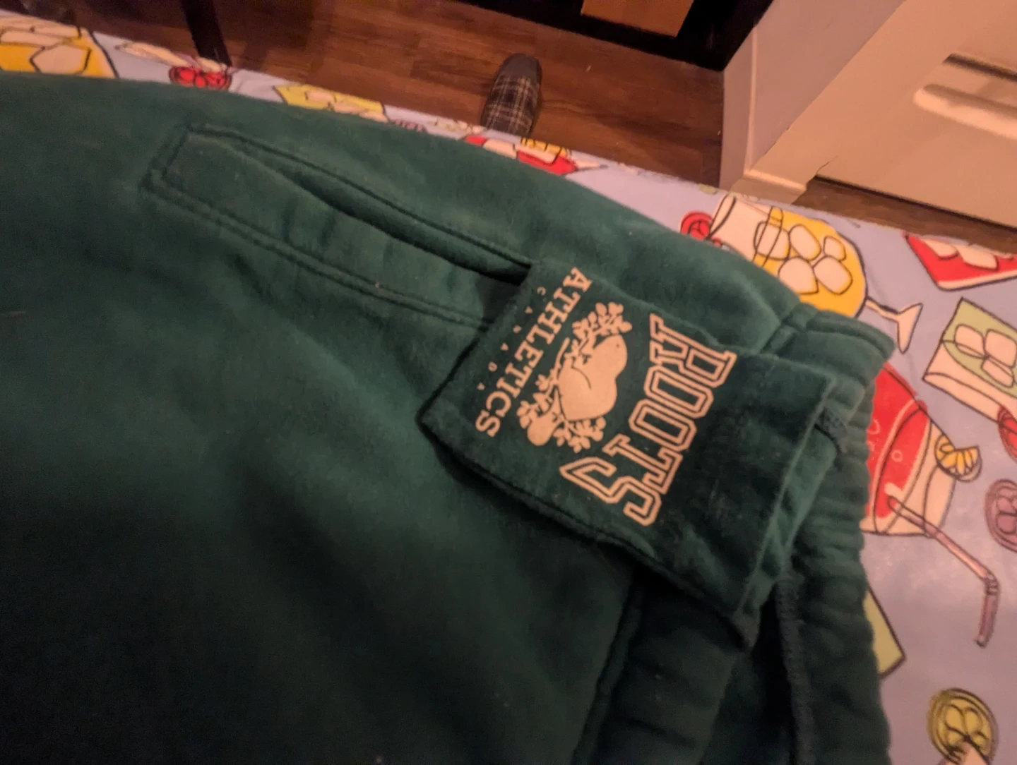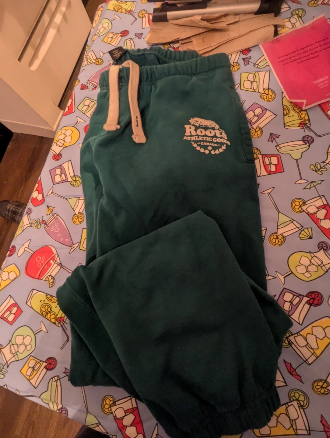 Selling a pair of Roots Athletics Canada sweatpants in size large! They're a nice, comfortable green colour and in good condition. Perfect for lounging around the house or running errands!