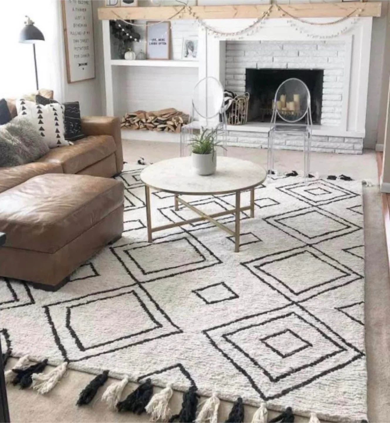 Selling a stylish area rug with a black and white geometric pattern. It's in great condition and would look fantastic in any living room or bedroom!