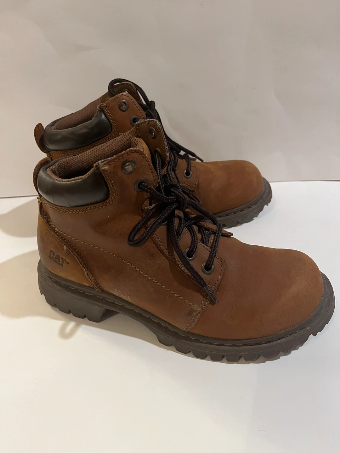 Selling a pair of CAT work boots in brown leather. They have black laces and a rugged sole. Great for work or outdoor activities!