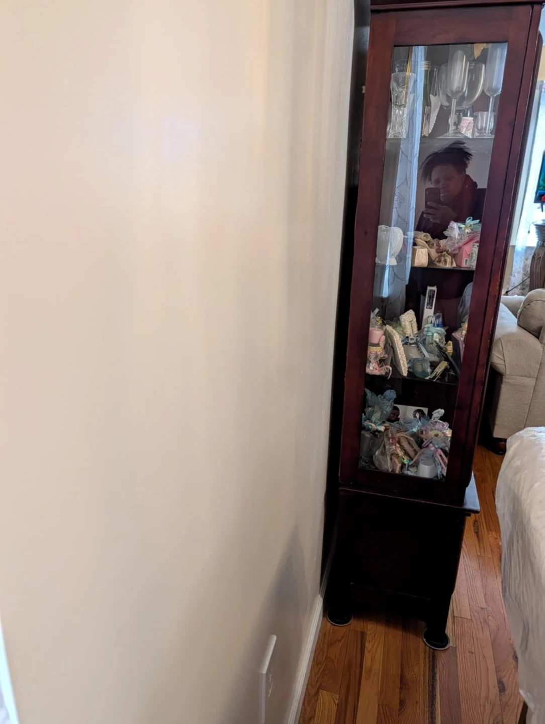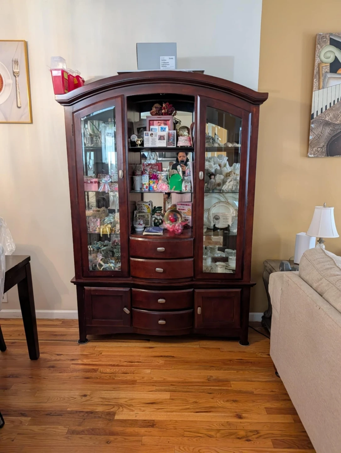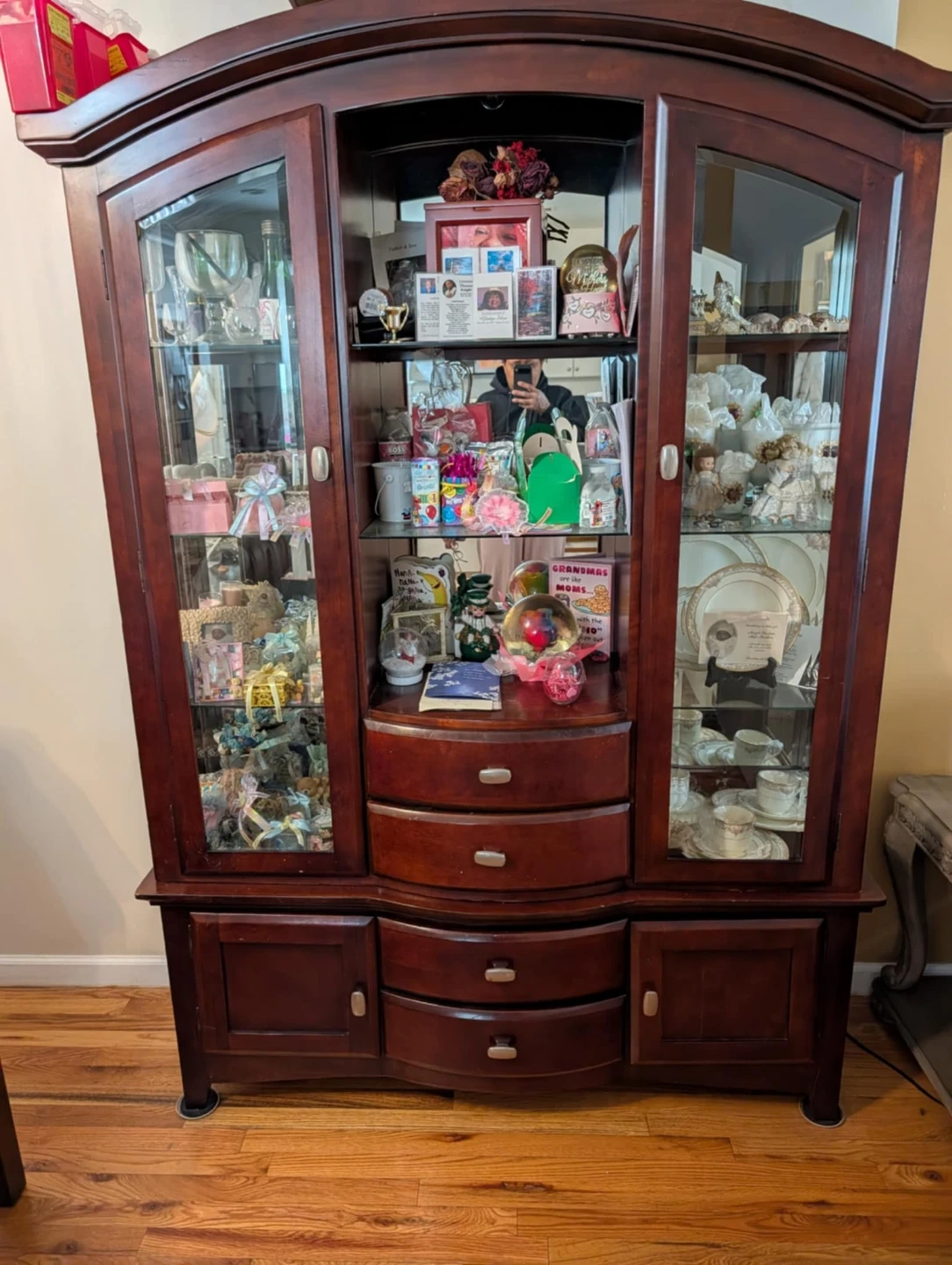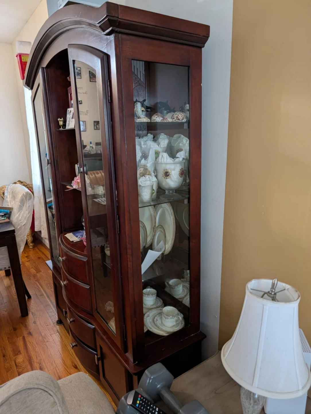 Selling a wall unit display cabinet. It has glass doors and multiple shelves for displaying items. There are also drawers and cabinets at the bottom for additional storage. Perfect for showcasing your collectibles or storing your belongings! Light not working handi person can fix