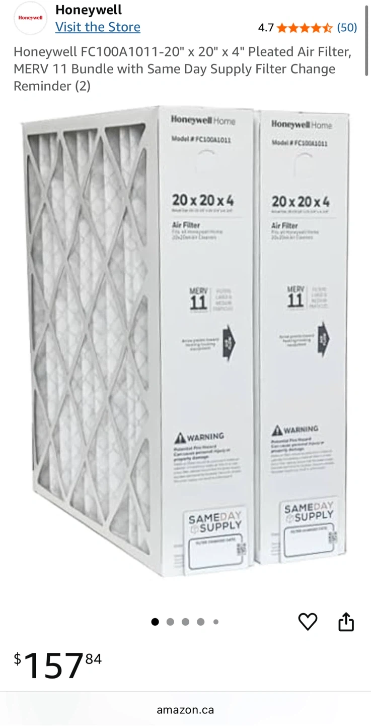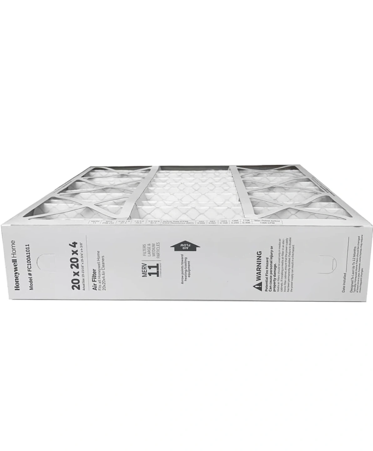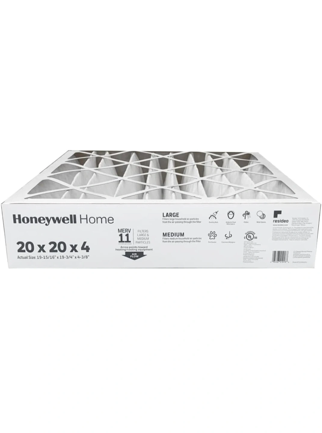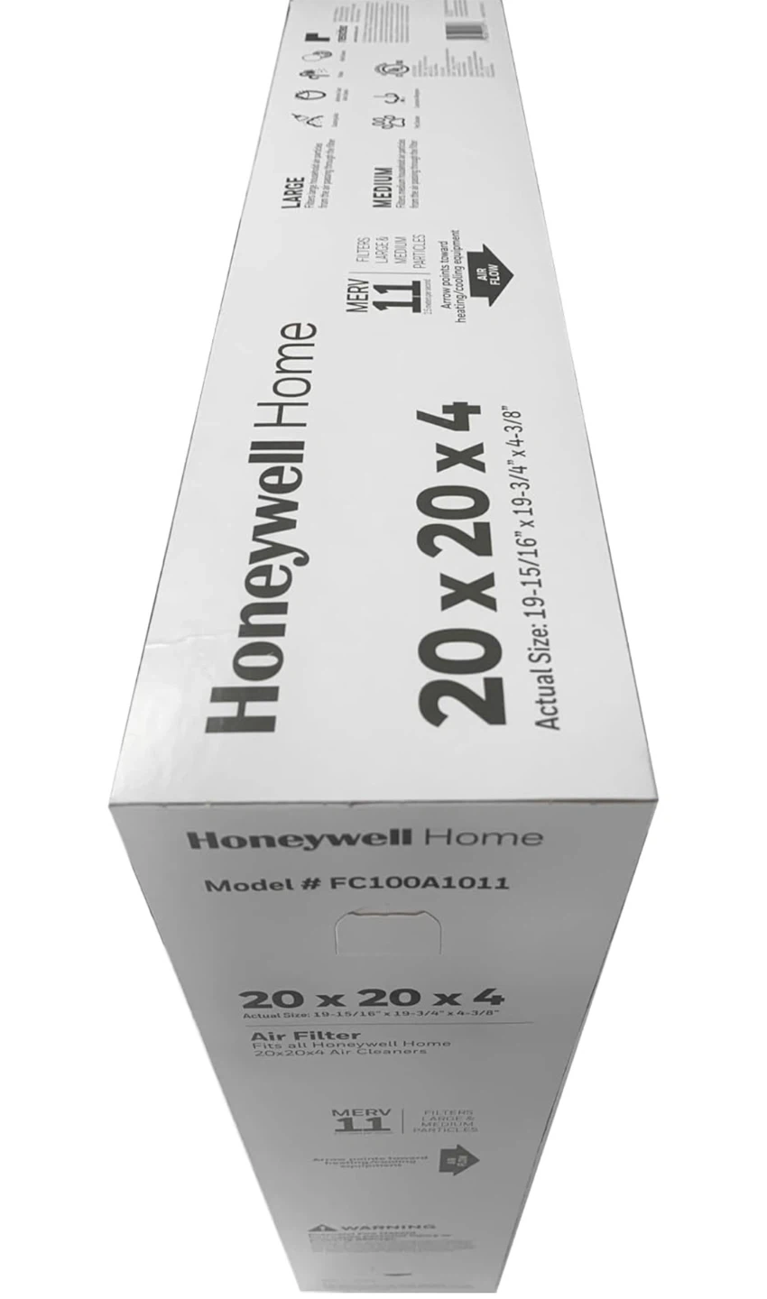 Selling a Honeywell Home air filter, size 20x20x4. It's designed for 20x20x4 air cleaners and has a MERV 11 rating for filtering large and medium particles. The actual size is 19-15/16" x 19-3/4" x 4-3/8".