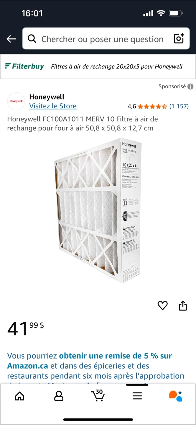 Selling a Honeywell Home air filter, size 20x20x4. It's designed for 20x20x4 air cleaners and has a MERV 11 rating for filtering large and medium particles. The actual size is 19-15/16" x 19-3/4" x 4-3/8".