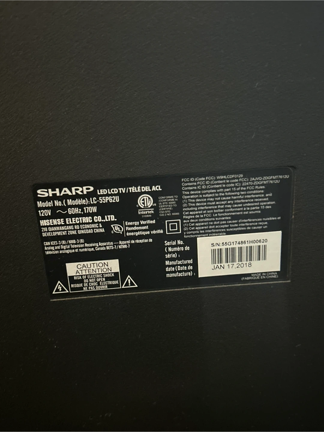 Selling a Sharp 55-inch LED LCD TV, model LC-55P62U. It runs on 120V ~ 60Hz and 170W. Manufactured in January 17, 2018. It's in good working condition and ready for a new home!