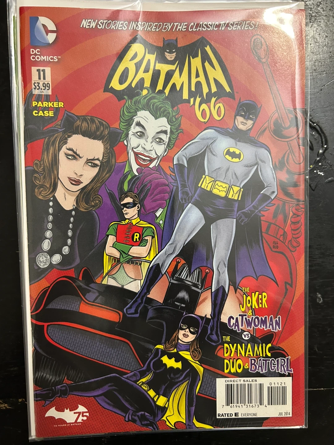 Selling a Batman '66 comic book featuring The Joker & Catwoman vs The Dynamic Duo-Batgirl. This comic is rated E for Everyone and has a cover price of $3.99. It's issue number 11 in the series. A must-have for any Batman fan!
