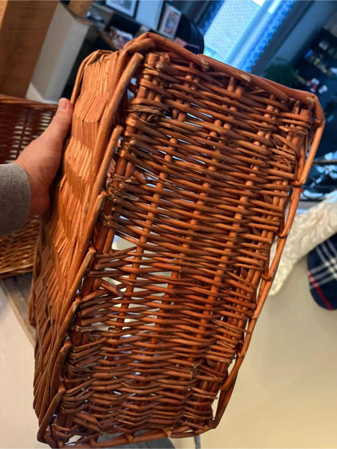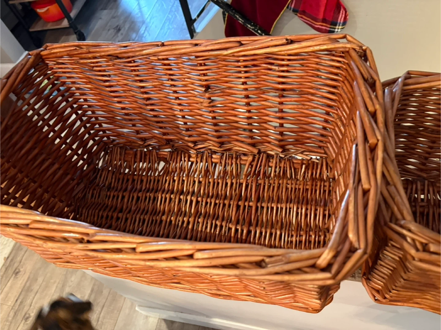 Selling two wicker storage baskets. They're a warm brown colour and in good condition. Great for organizing your home!