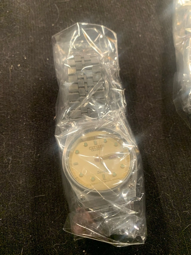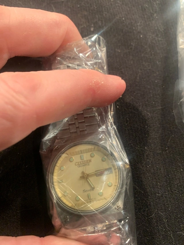 Check out this vintage Citizen Quartz "Seven" watch! It's in new condition, still sealed in plastic, and has a really cool glow-in-the-dark feature for nighttime visibility. It is a true gem for collectors and enthusiasts alike!