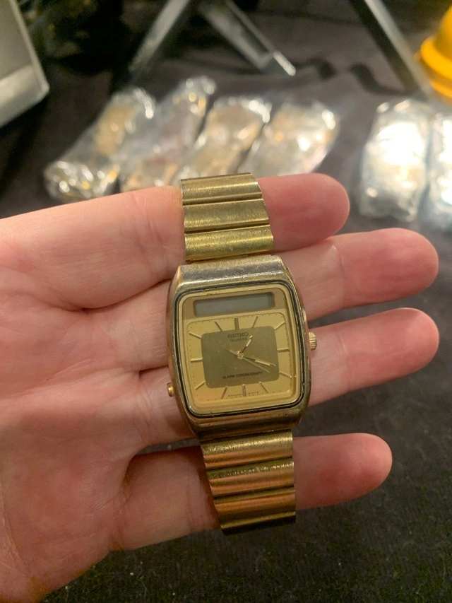 Check out this used SEIKO Super Xool Alarm Chronograph, a rare find with a gold-plated finish. While it shows signs of wear, this vintage timepiece is a unique addition to any watch collection. Selling as-is.