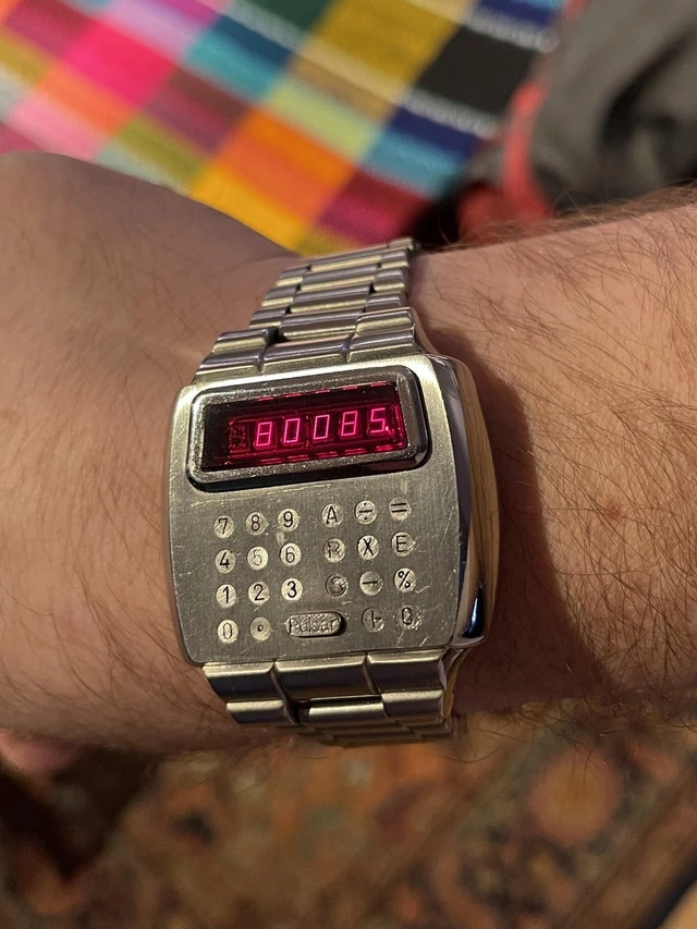 Step back into the 1970s with this iconic Pulsar Calculator Watch! A true conversation piece, this vintage digital watch features a functional calculator, perfect for adding a touch of retro-cool to your wrist. It's in good condition for its age. The watch is a pre-owned item. Don't miss your chance to own a piece of history! If the ad's up, it's still available, so you're in luck! I can't wait to find this timepiece a new home!