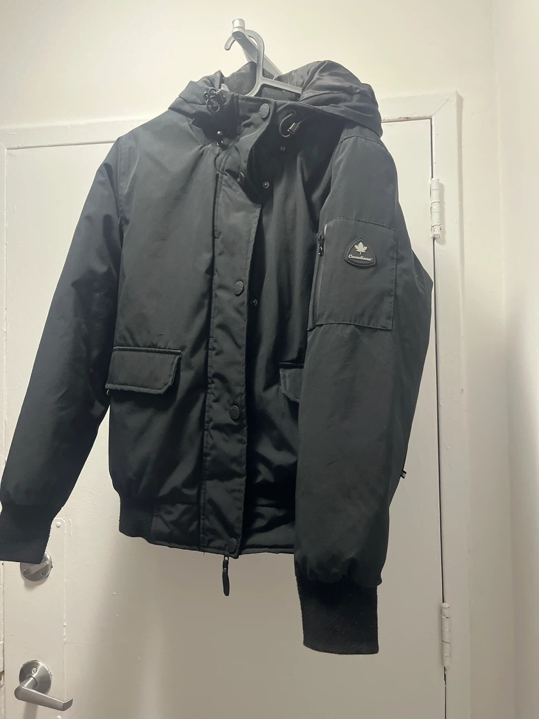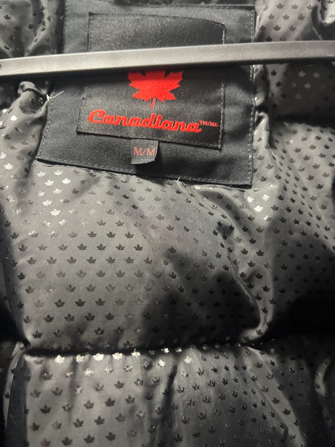 Selling a black down-filled bomber jacket from Canadiana. It's in great condition and ready for the colder weather! Size is M/M.