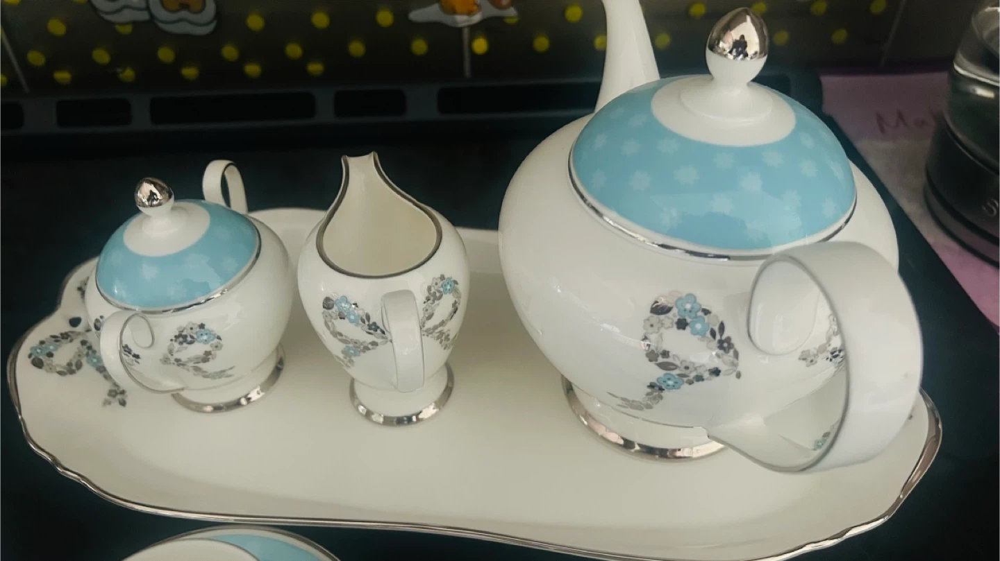 Made in Japan. Selling a beautiful Narumi Bone China tea set! It includes a teapot, sugar bowl, creamer, four cups, four saucers, four plates, and four spoons. The set is white with a light blue accent colour and a delicate floral design. Perfect for tea parties or adding a touch of elegance to your home!