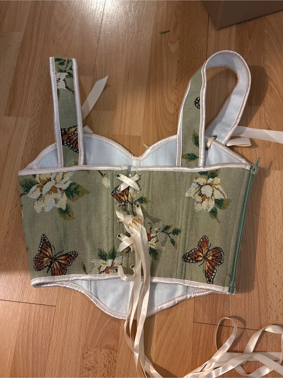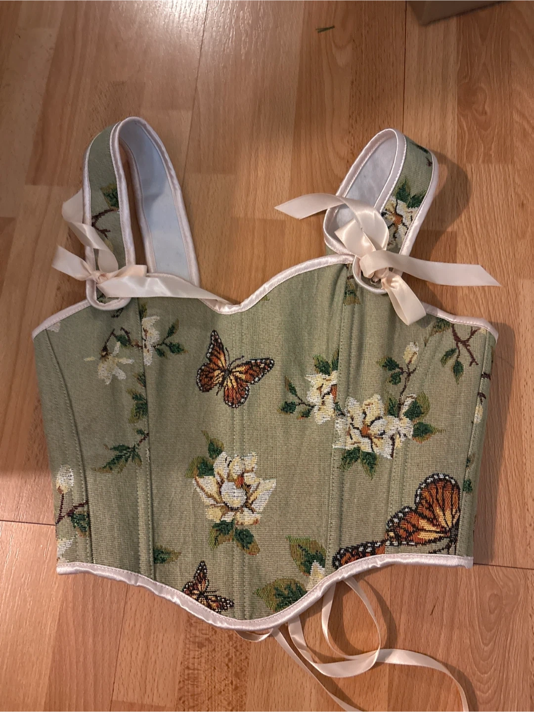 This is a cute floral tapestry corset top! It has a lace-up back and ribbon straps. The corset features a green background with a floral and butterfly pattern. Perfect for adding a unique touch to your wardrobe