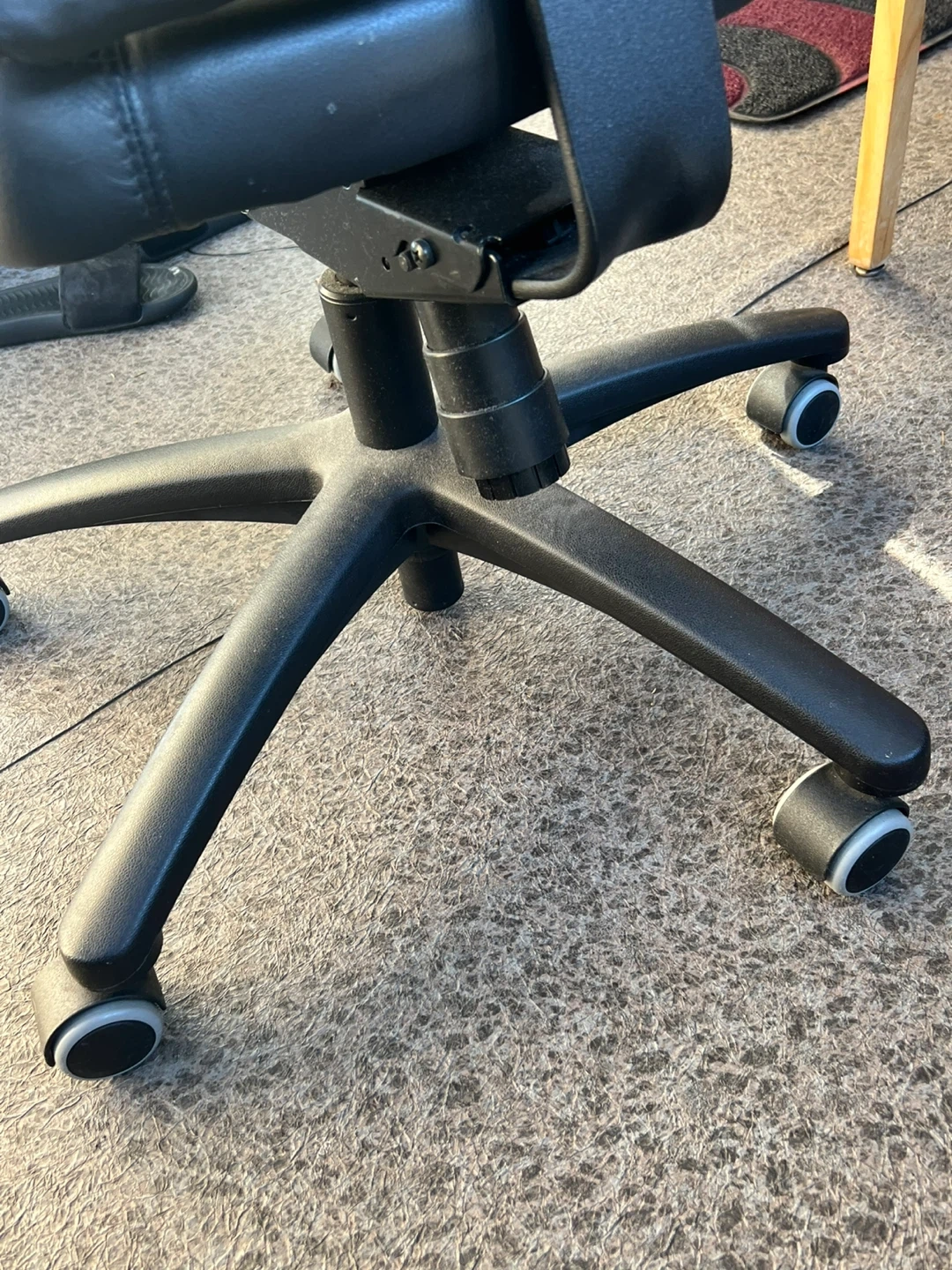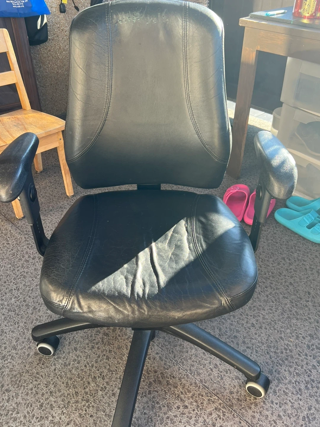 Selling a black office chair that's in used condition. It's still very functional, all wheels rolling properly and comfortable for everyday use at your desk or home office. Perfect for anyone needing a reliable chair!