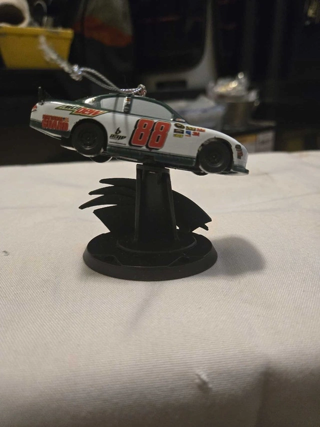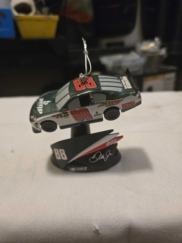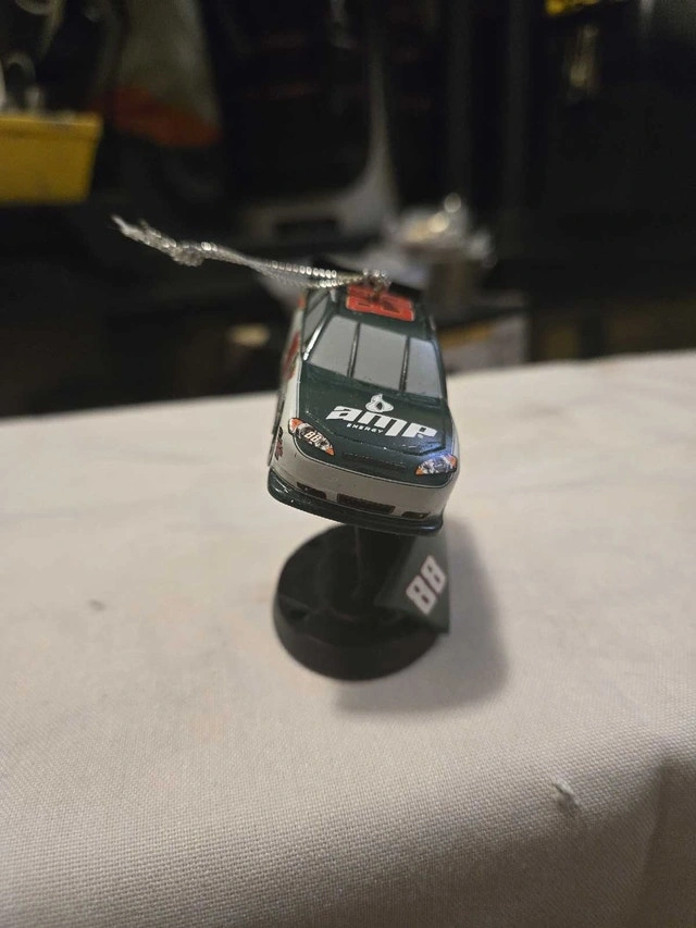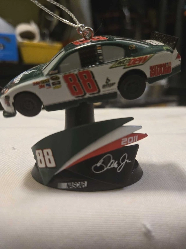 Add some racing flair to your holiday decorations with this 2011 Dale Jr #88 NASCAR ornament, showcasing the AMP Energy/Mountain Dew design. This ornament is in used condition, ready to bring some speed to your Christmas tree. Looking to add a touch of whimsy and horsepower to your holiday season? Look no further! And remember, if the ad is up, the ornament is ready to race to its new home!