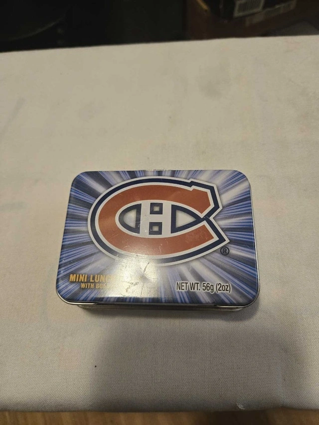 I'm selling a Montreal Canadiens mini lunch box tin, a perfect item for any hockey collector. This item is in good, used condition, showing some wear that adds to its vintage charm. It's a cool piece of memorabilia that brings a touch of nostalgia. Let me know if you're interested!