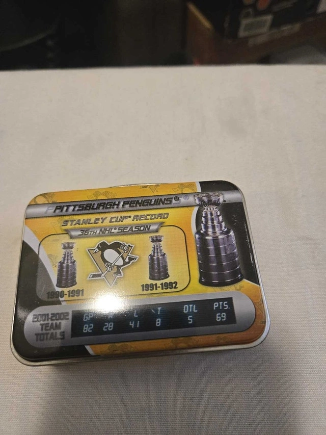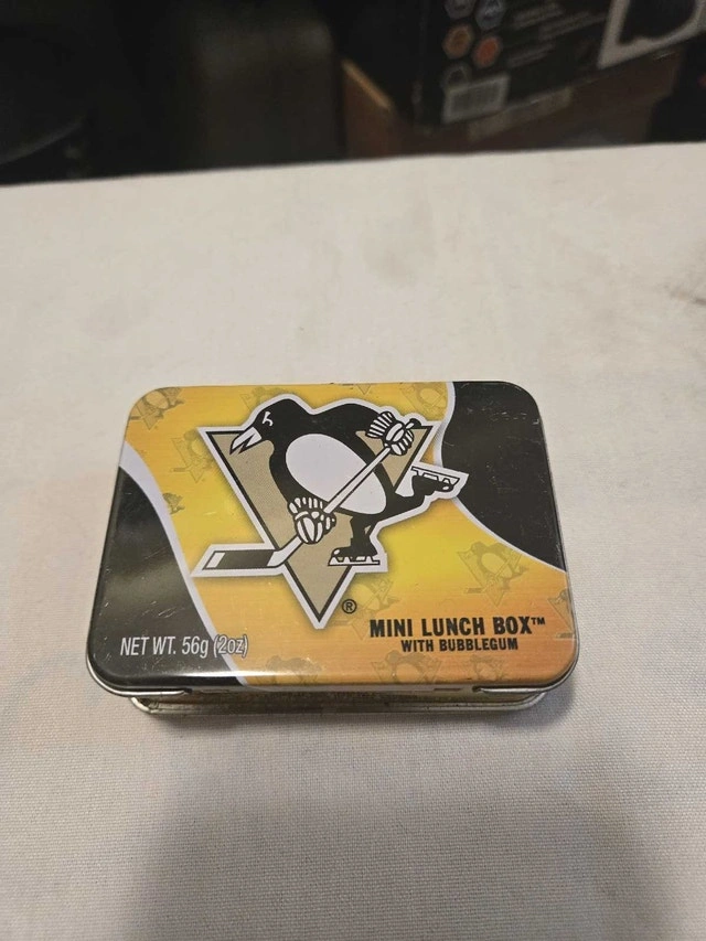 This mini lunch box commemorates the Pittsburgh Penguins' Stanley Cup record and 25th NHL season. It's perfect for holding small collectables. It's in used condition but in overall good shape, it's ready to show off your Penguins pride! Don't miss out on this piece of Penguins history! If the ad is still up, yes, it's still available!