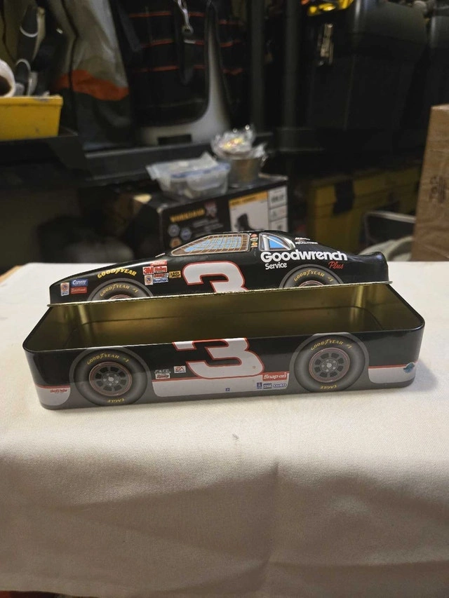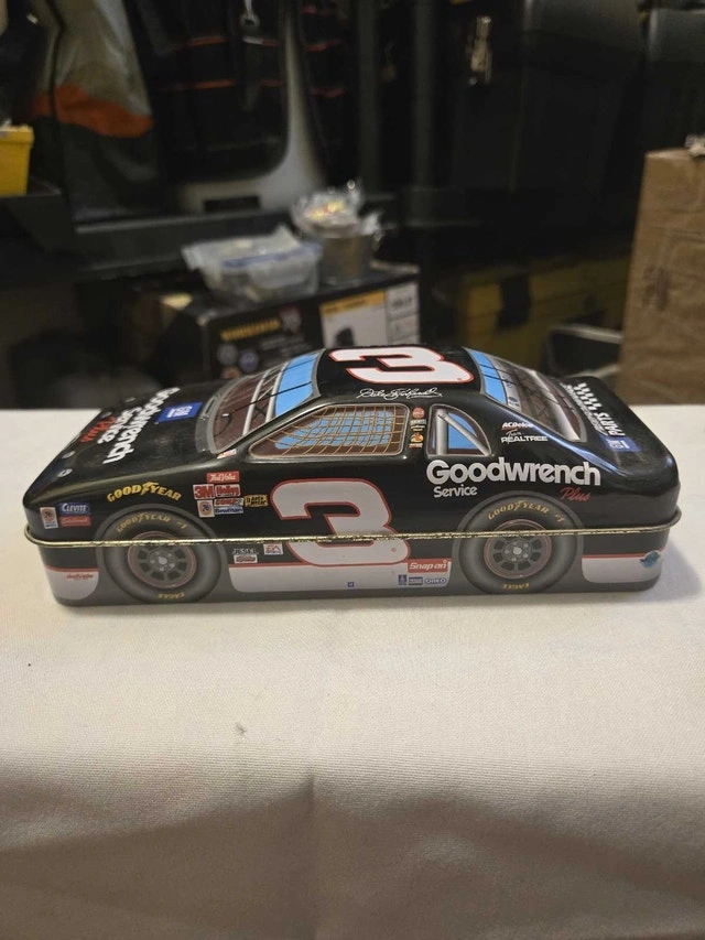 I'm selling a used Dale Earnhardt #3 Goodwrench Service Plus Monte Carlo tin. It's a collectible piece that would be great for any NASCAR or Earnhardt fan. This tin does show signs of wear, reflecting its age and previous use, but it still has vibrant colours. This collectible tin is a wonderful piece of memorabilia. I'm sure it will find a good home. If the ad is up, the item is available!