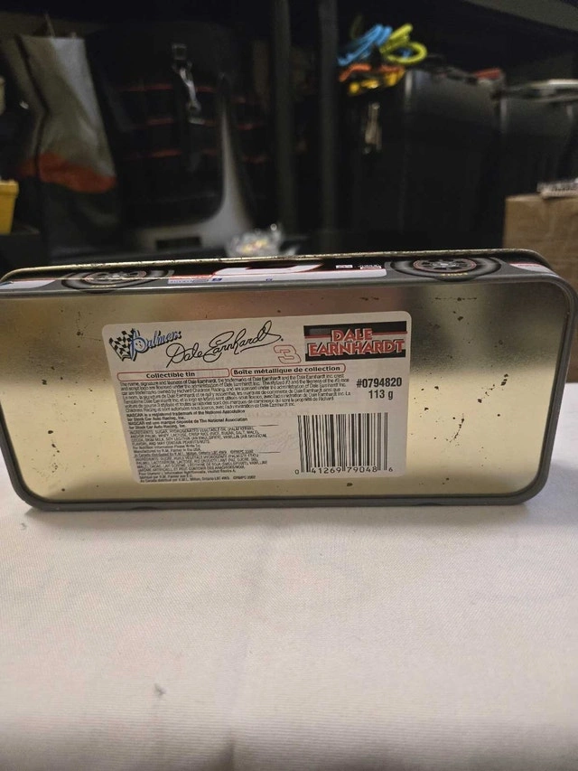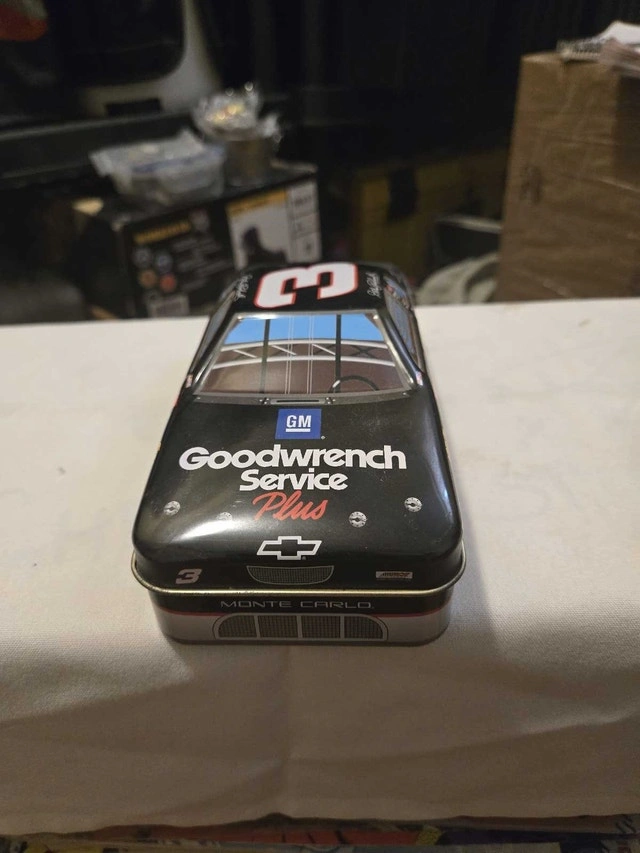 I'm selling a used Dale Earnhardt #3 Goodwrench Service Plus Monte Carlo tin. It's a collectible piece that would be great for any NASCAR or Earnhardt fan. This tin does show signs of wear, reflecting its age and previous use, but it still has vibrant colours. This collectible tin is a wonderful piece of memorabilia. I'm sure it will find a good home. If the ad is up, the item is available!