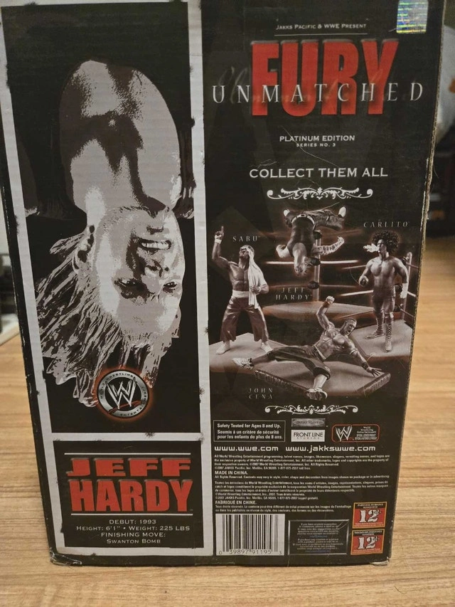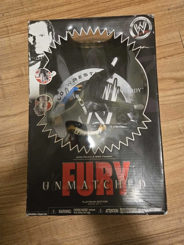 Own a piece of wrestling history with this Jakks Pacific & WWE Present Fury Unmatched Platinum Edition Series No. 2 Jeff Hardy action figure! This unique collectible is in used condition, adding to its vintage appeal. Perfect for display or adding to your wrestling memorabilia, this action figure captures Jeff Hardy in his signature pose. The packaging shows wear, which only enhances its nostalgic charm. If you're seeing this ad, then yes, it's still available!
