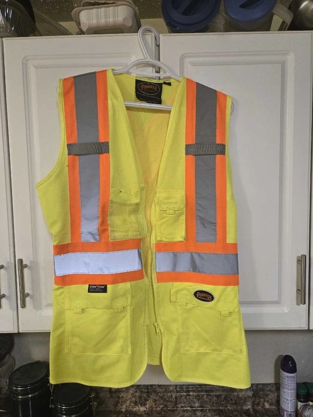 I'm selling a Pioneer safety vest, size large, in excellent condition. It's a hi-vis yellow colour with reflective stripes, perfect for construction, traffic control, or any job where visibility is key. This vest has seen minimal use and is ready to keep you safe on the job! * Hi-Vis Yellow * Reflective Striping * Zipper Closure * Multiple Pockets Based on similar listings, a used safety vest like this typically sells for around $20-$35. I'm asking $30, which reflects the great condition it's in. If the ad's up, it's available!