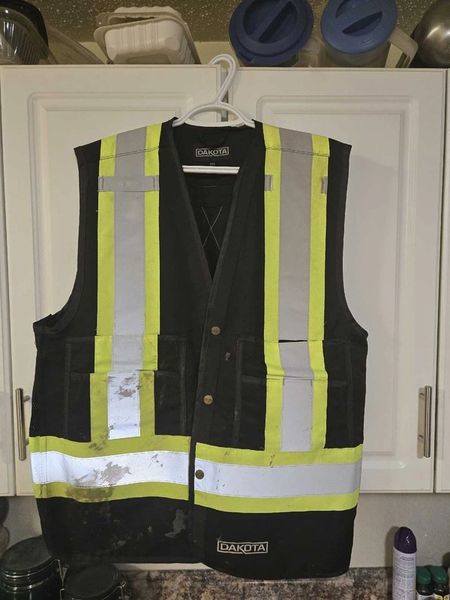 I am selling a used Dakota safety vest in size L/XL, designed with high-visibility materials and reflective strips for enhanced safety in low-light conditions. This vest is ideal for construction, traffic control, or any job requiring increased visibility. Note that because this is a used safety vest, there is some staining.
