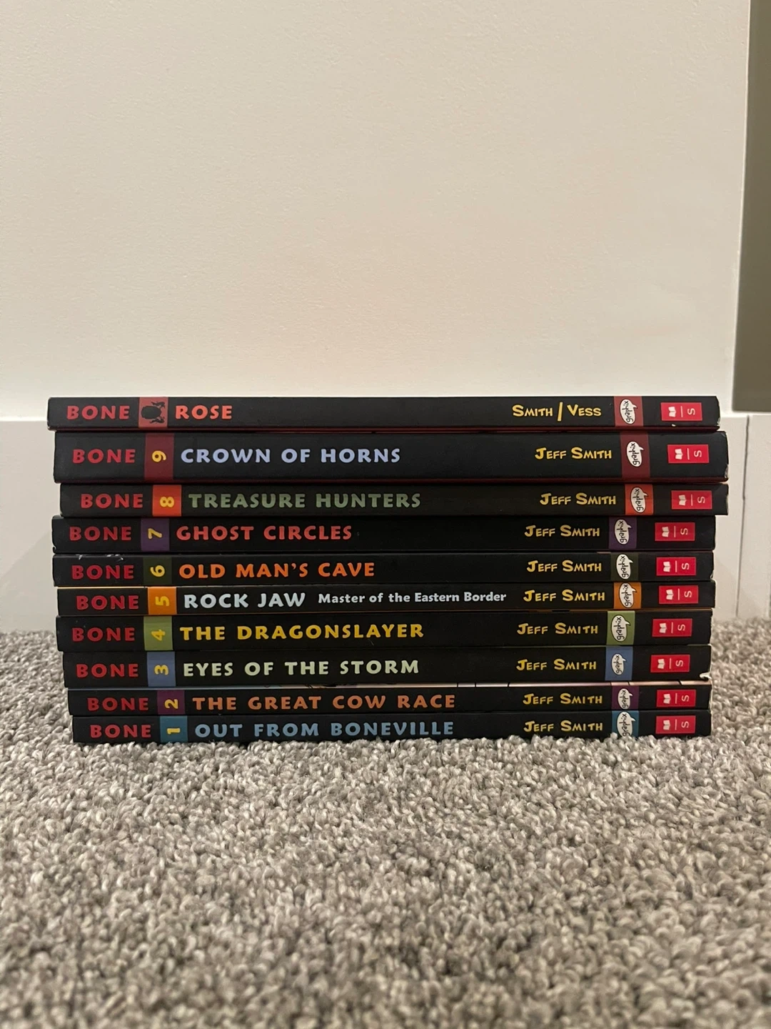 Selling the complete Bone series by Jeff Smith! This includes all nine books plus the prequel book Rose. Books are in very good condition and will only sell as a set
