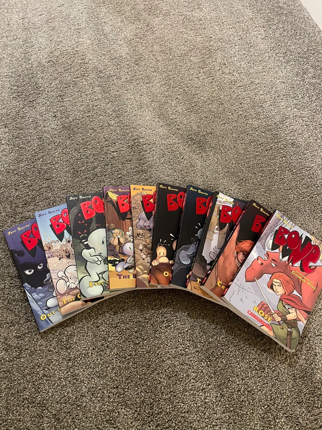 Selling the complete Bone series by Jeff Smith! This includes all nine books plus the prequel book Rose. Books are in very good condition and will only sell as a set