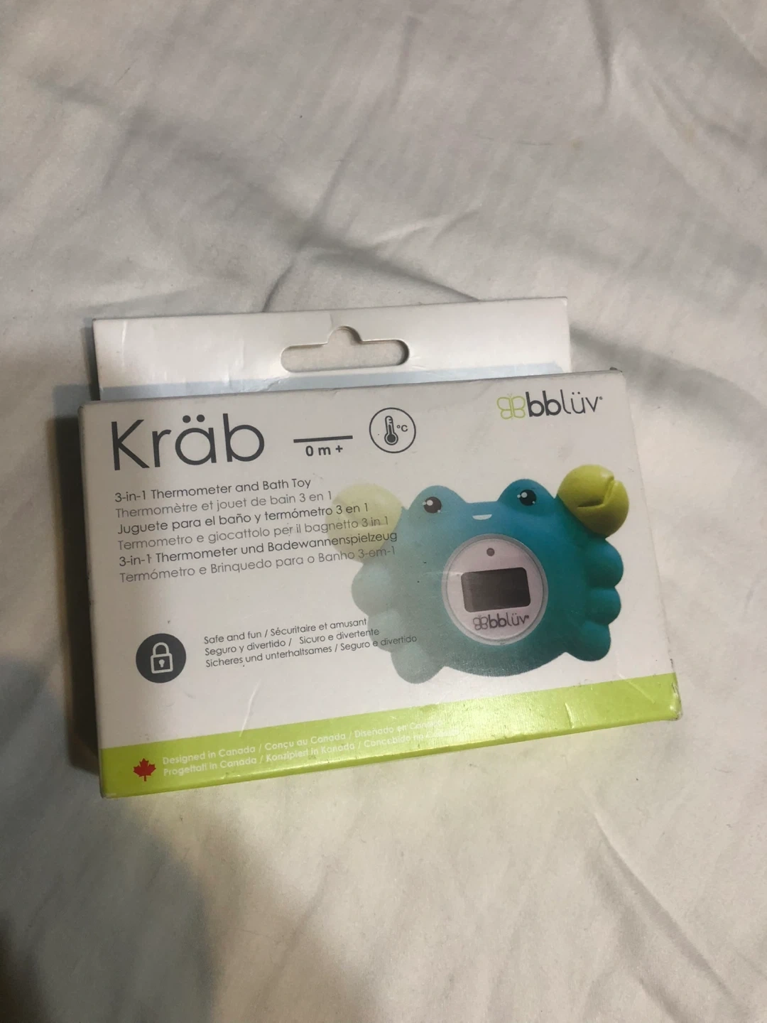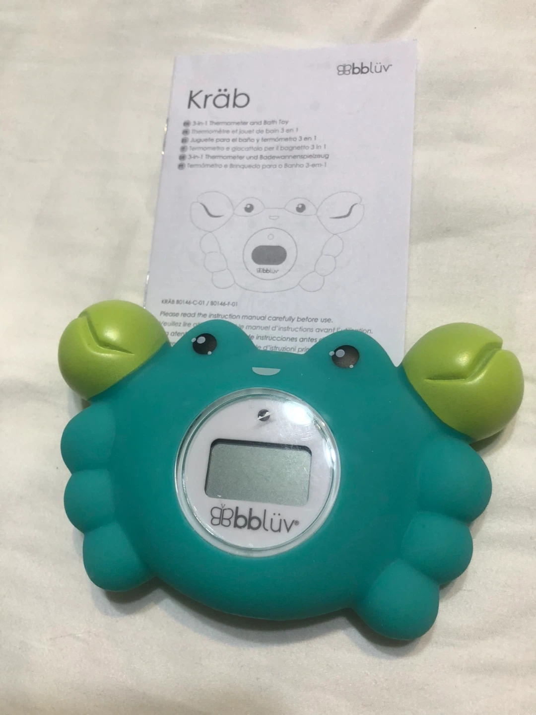 This is a bblüv Kräb 3-in-1 Thermometer and Bath Toy. It's designed for 0 months and up. It's a safe and fun way to check the bath temperature for your little one!