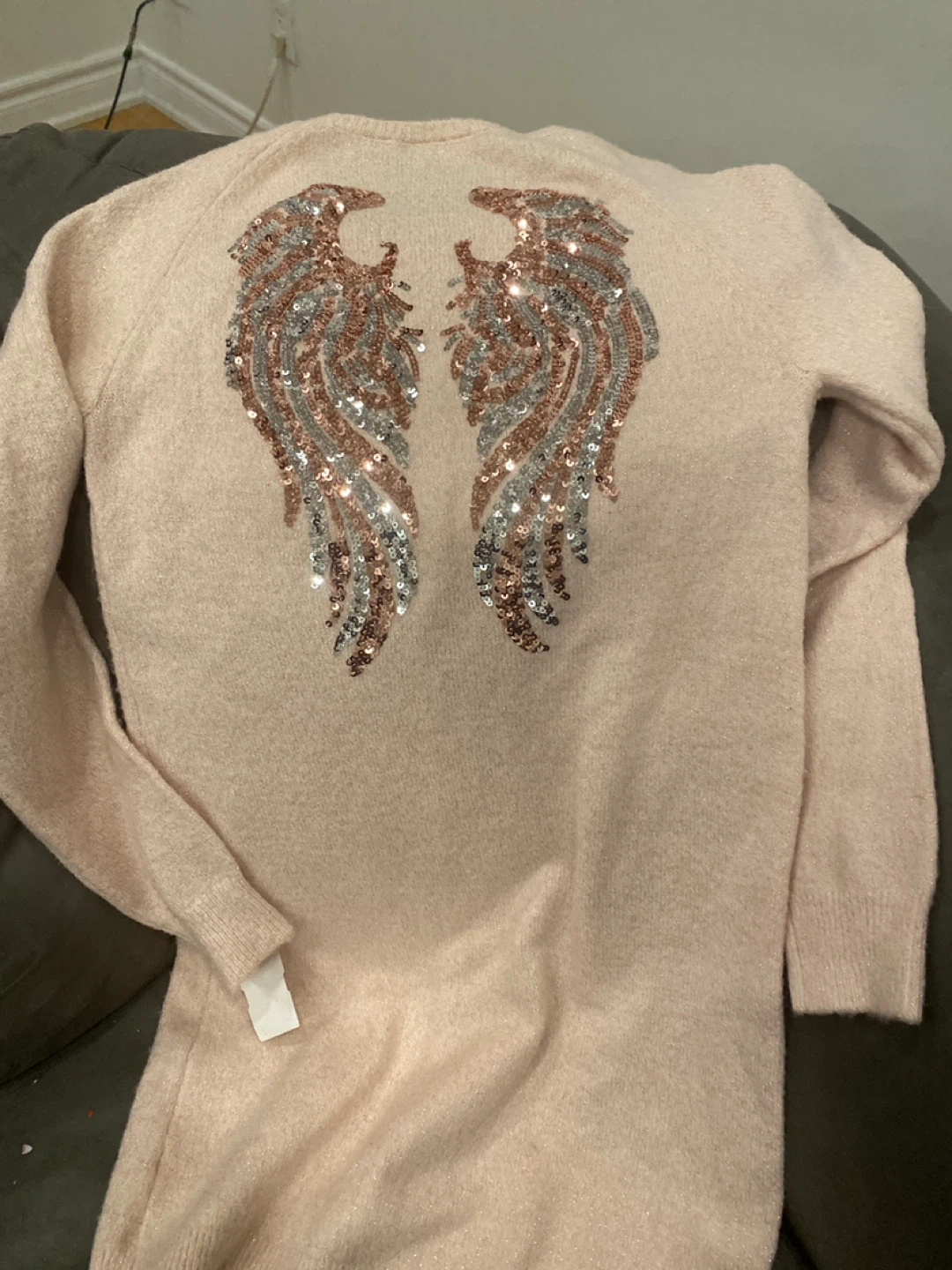 Selling a cute pink sweater dress with sparkly wing embellishments on the back! It's in great condition and ready for a new owner