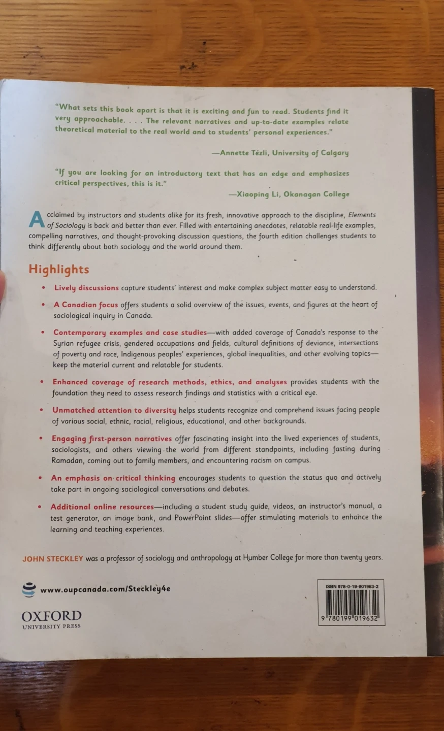 Selling a copy of "Elements of Sociology: A Critical Canadian Introduction" by John Steckley. This is the fourth edition, published by Oxford University Press. It offers a Canadian focus, covering issues and events relevant to sociological inquiry in Canada. The book includes contemporary examples and case studies, addressing topics like the refugee crisis and global inequalities. It also emphasizes critical thinking and provides additional online resources such as study guides and PowerPoint slides