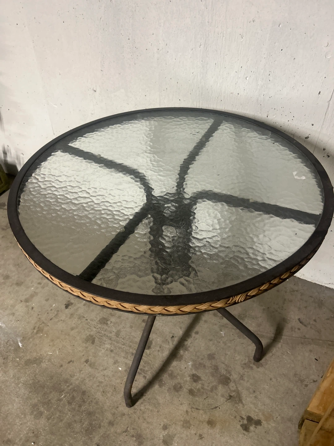 Selling a round glass top patio table. It features a metal frame and a decorative woven edge around the glass. Perfect for a small outdoor space or balcony