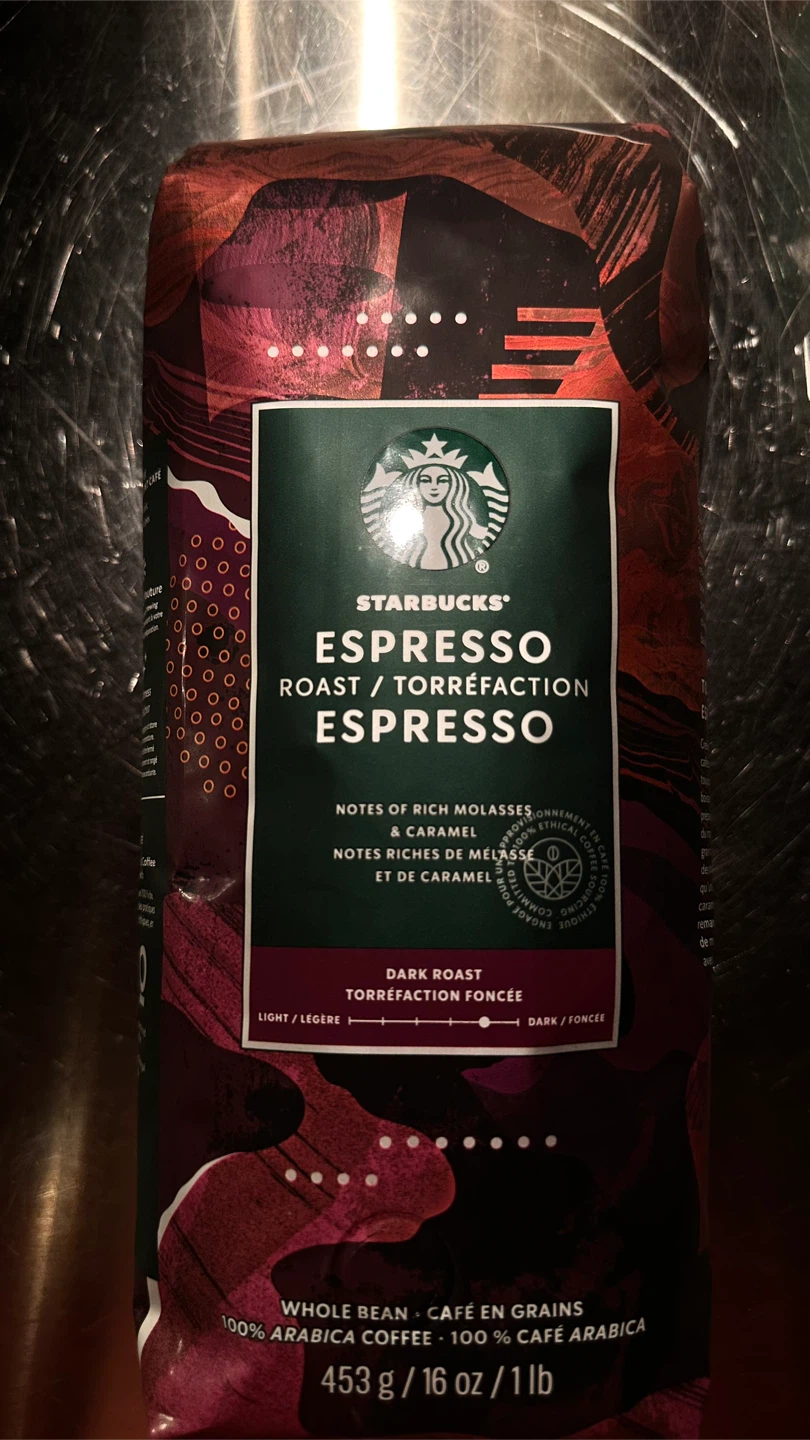 Selling a bag of Starbucks Espresso Roast whole bean coffee. It's a dark roast with notes of rich molasses and caramel. Perfect for making espresso at home! The bag contains 1lb of 100% Arabica coffee